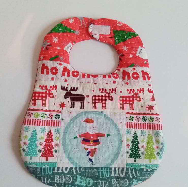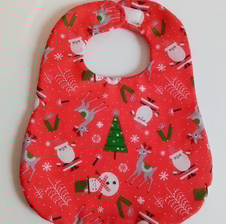 A Christmas bib suitable for over 3 months with a Velcro fastening to make neck size adjustable.