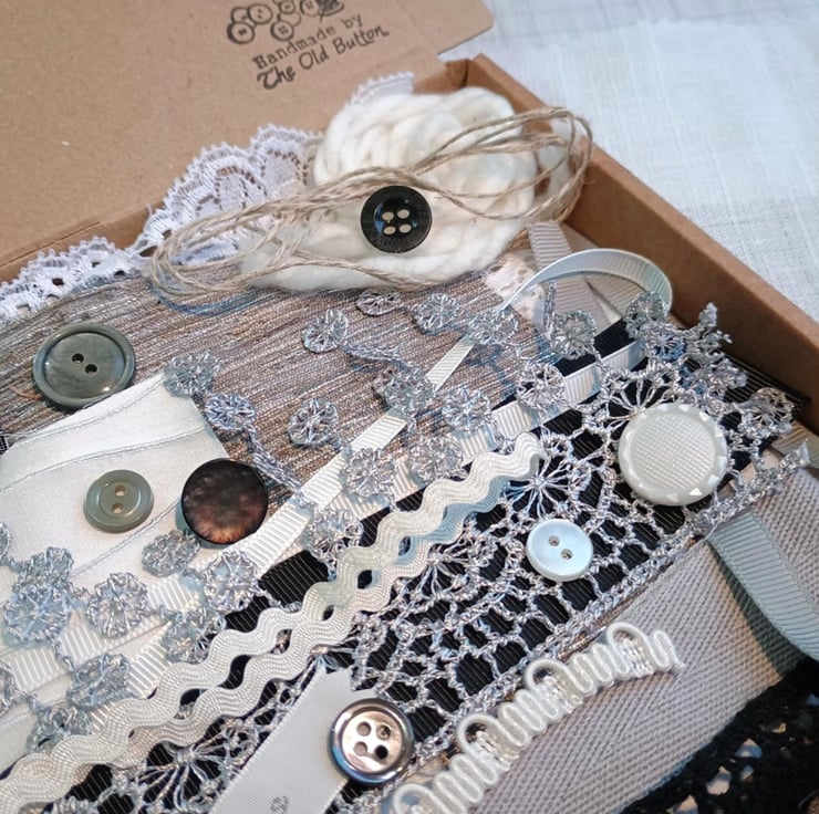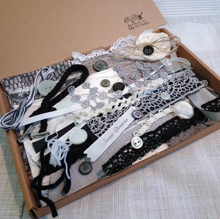 Available in 2 sizes. The photos show the A5 starter box, and includes over 30 items of carefully curated vintage, reclaimed or salvaged textiles and haberdashery. The A4 box has over 40 items, including extra curtain fabrics in larger sizes, more variety of trims and a bigger foundation piece.