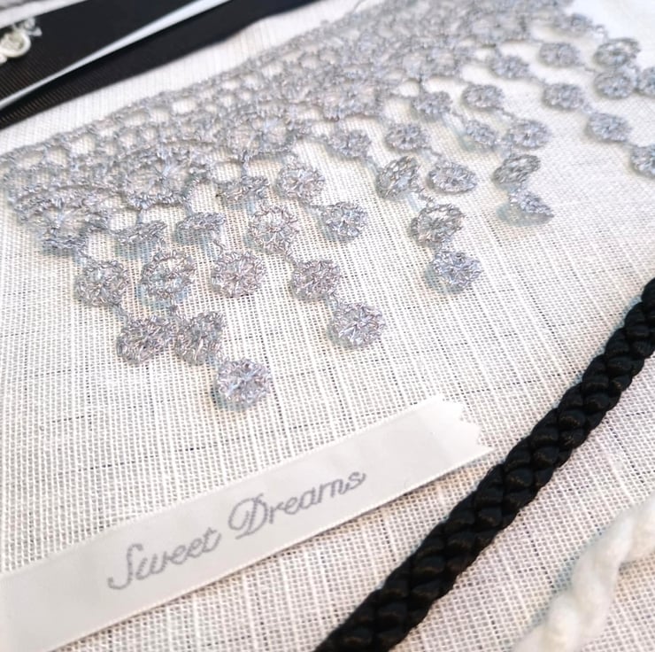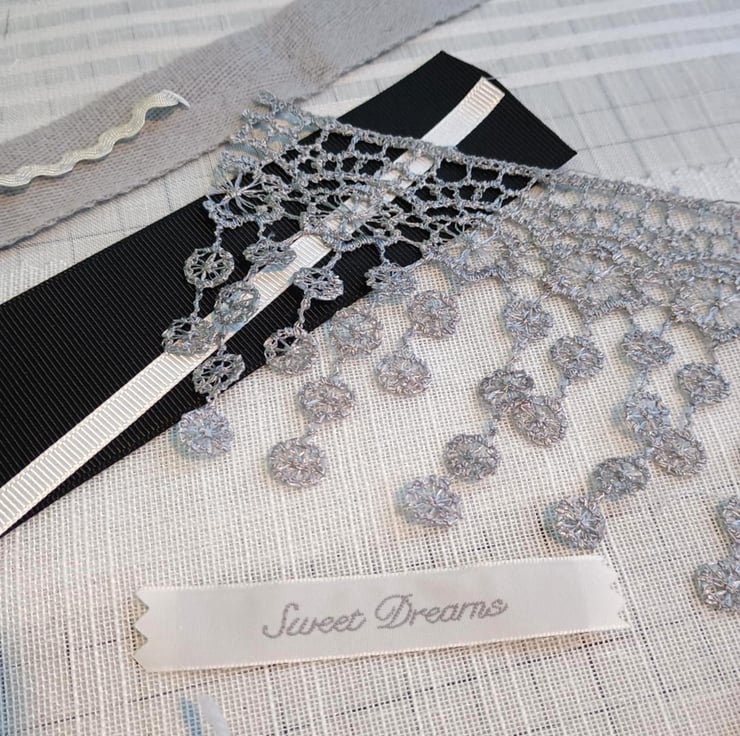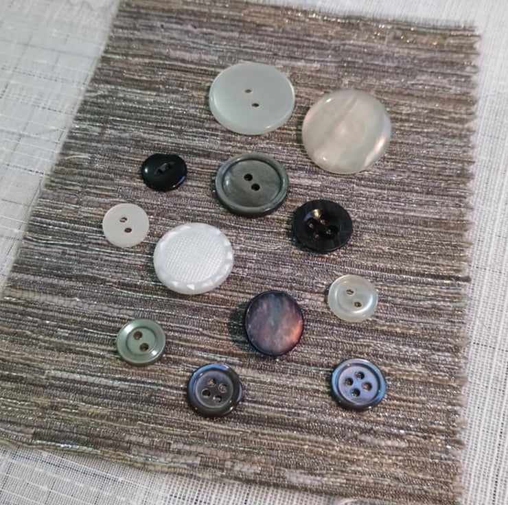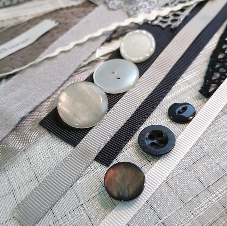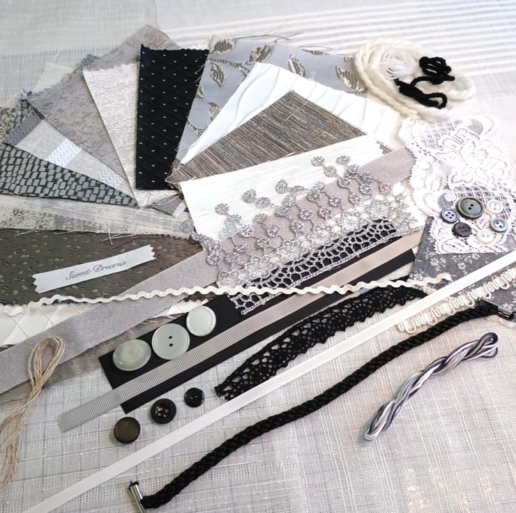 Looking for way to relax? Try slow stitching with my muted metallic textile kit in silver, pewter and steel, with cream, grey and black accents. Built around a collection of reclaimed curtain samples, with co-ordinating, ribbons, yarns, threads and buttons.