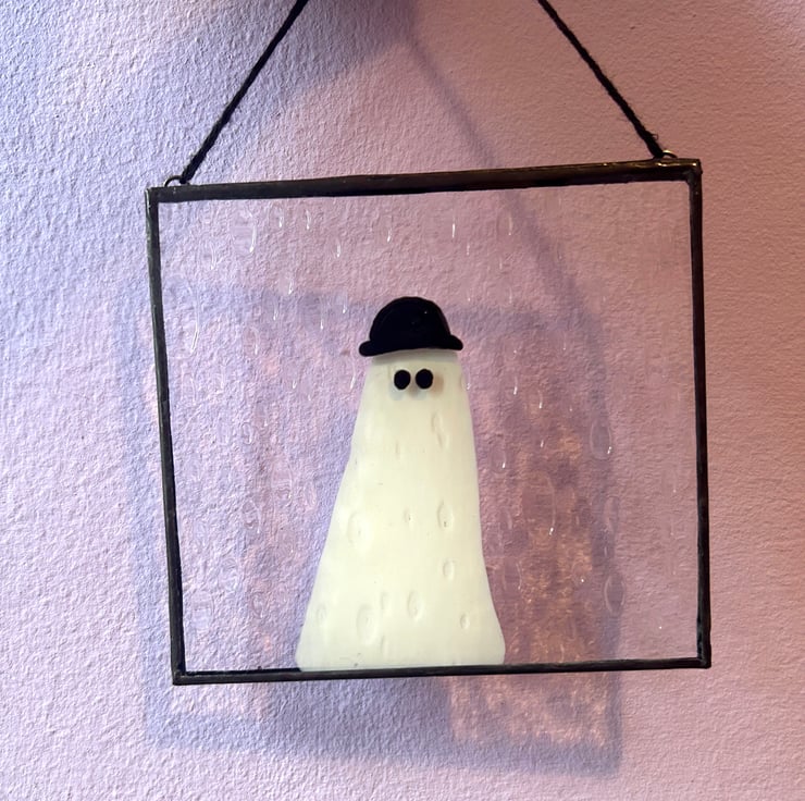 My Phantom Portrait series includes hand painted miniatures on textured clear glass with a raindrop effect. These charming little phantoms peer through a rain-splattered window, gazing at you in a cute and endearing way (definitely not spooky!).