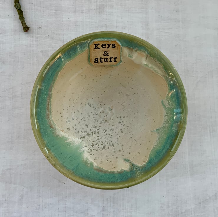 A cheerful wheel-thrown stoneware bowl, perfect for keeping all your keys and stuff in one place. Finished in Aurora Green and Sea Salt glazes, soft coastal tones blend beautifully with the speckled clay beneath. Hand-finished with a rustic label for a touch of charm. Ideal for keys, jewellery, or tiny treasures — each one is handmade and unique.