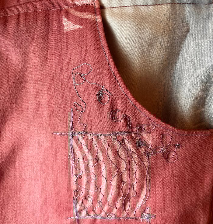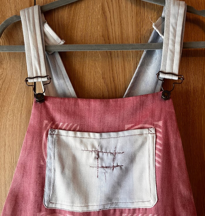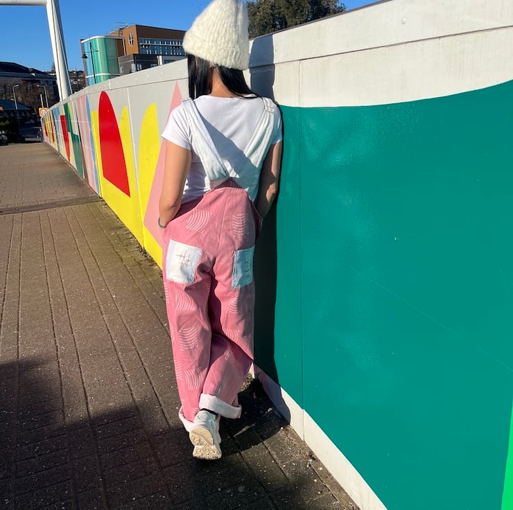 My vision was to make sustainable, comfortable, stylish & unique clothes from pre-loved fabric. I knew the curtains I had would look great as dungarees, especially if I mixed the colours & added some free-motion machine embroidery.
