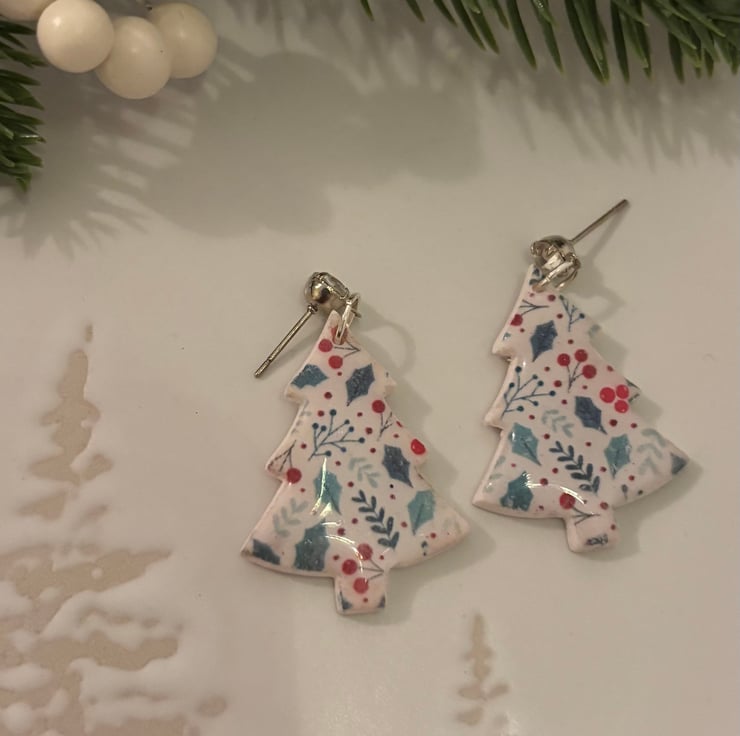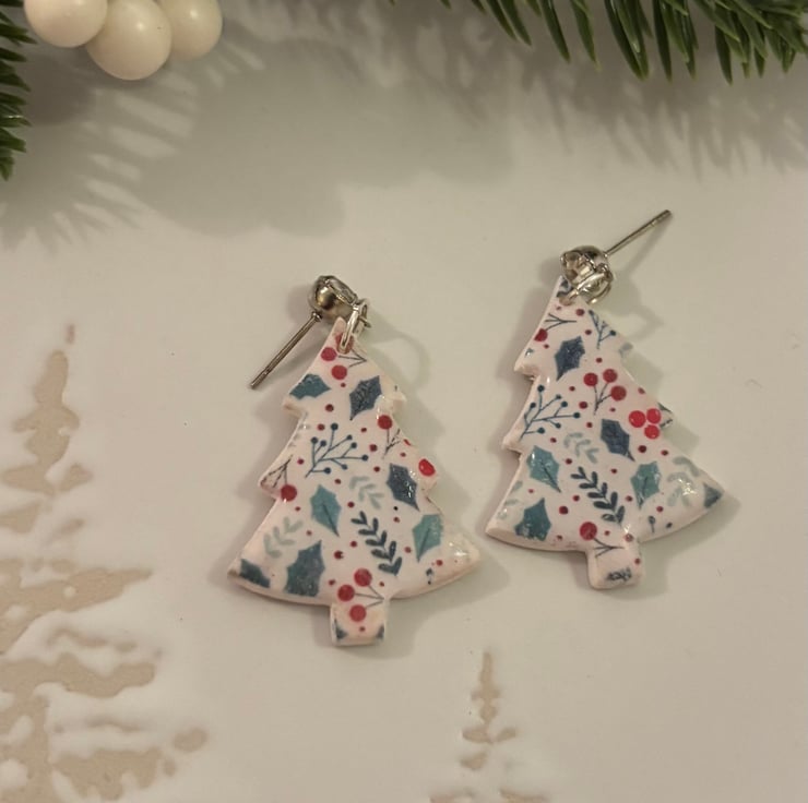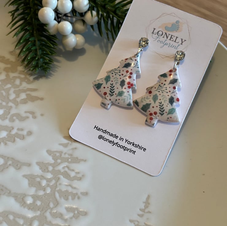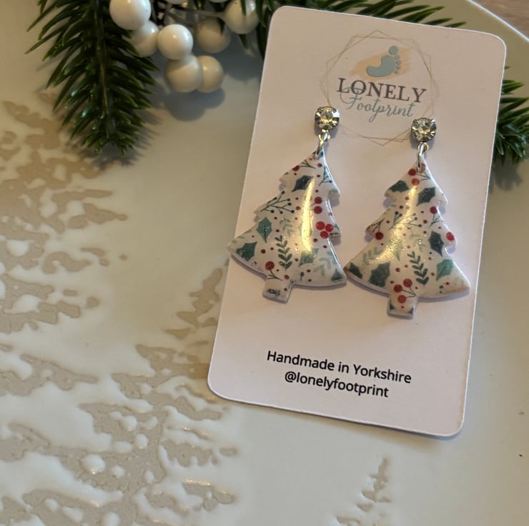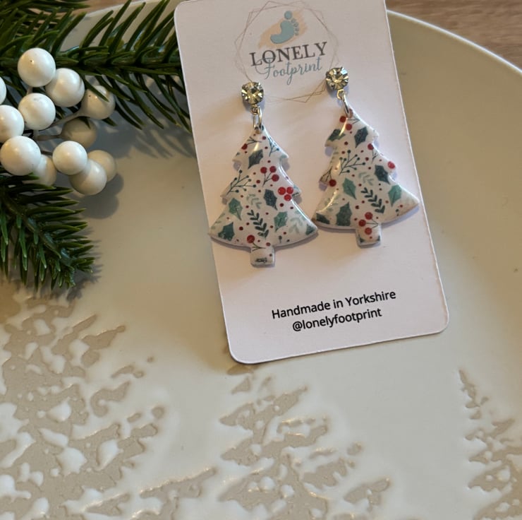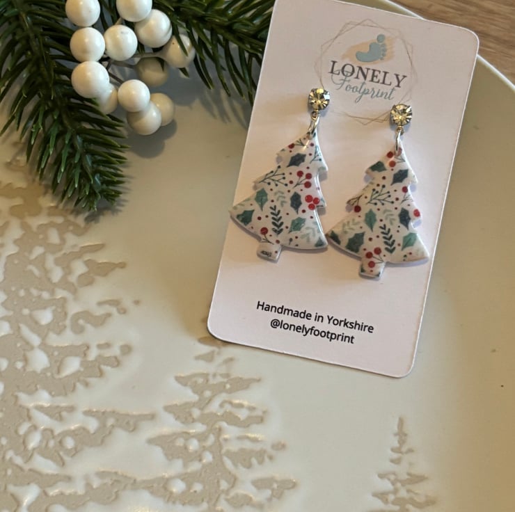 These Christmas tree earrings are handmade using polymer clay and a holly and berry design. Super lightweight and comfy to wear all day, they’re perfect for Christmas parties and wearing through the festive season.