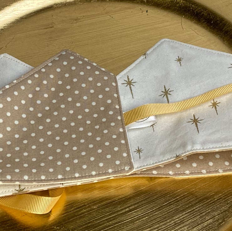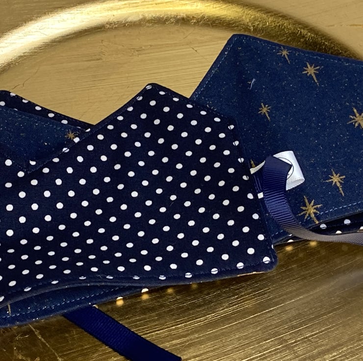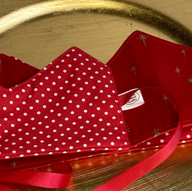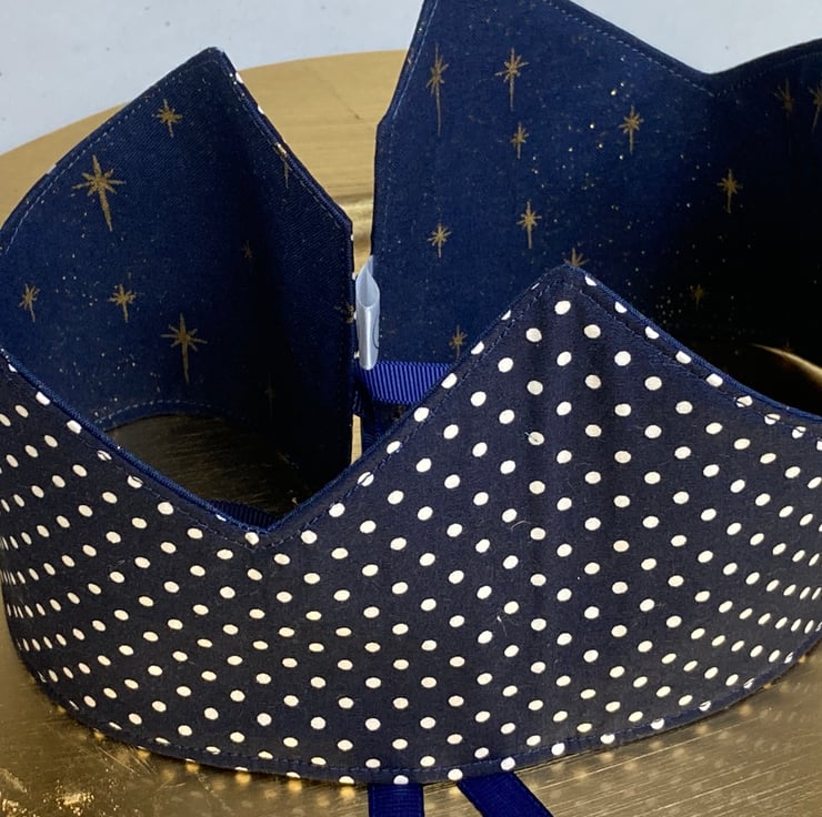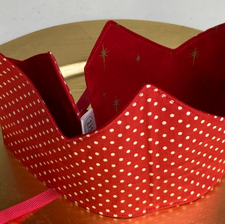 Here's a great way to add style and fun to your celebrations without producing a lot of waste. These reversible crowns will work hard for you. One side shows a classic Christmas cotton print - four different colours, each decorated with gold Star of Bethlehem patterns. The reverse is a coordinating poplin polka dot fabric. Rather than just using your crowns once a year, make more use of them for birthdays, anniversaries or just for primping a Sunday roast with the family.