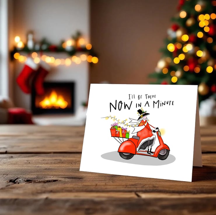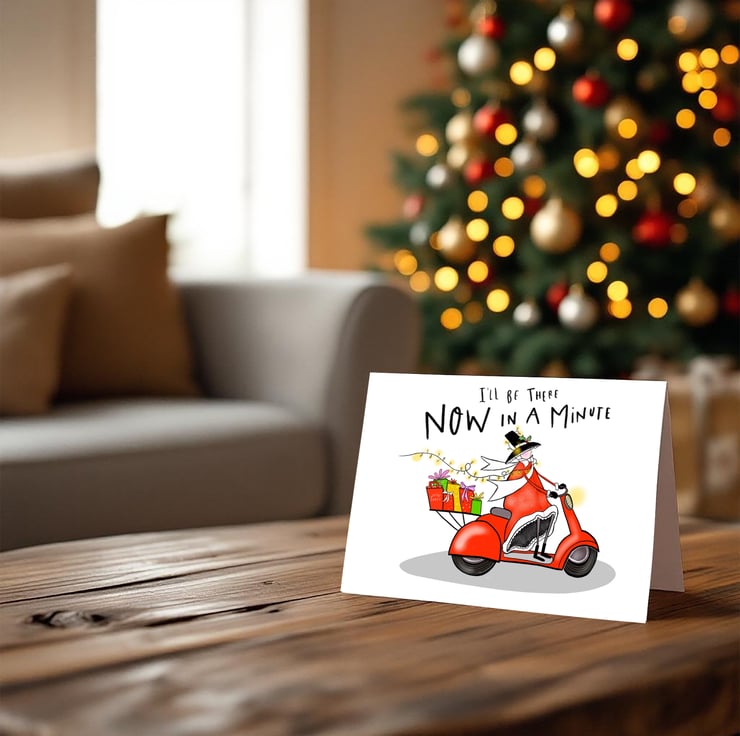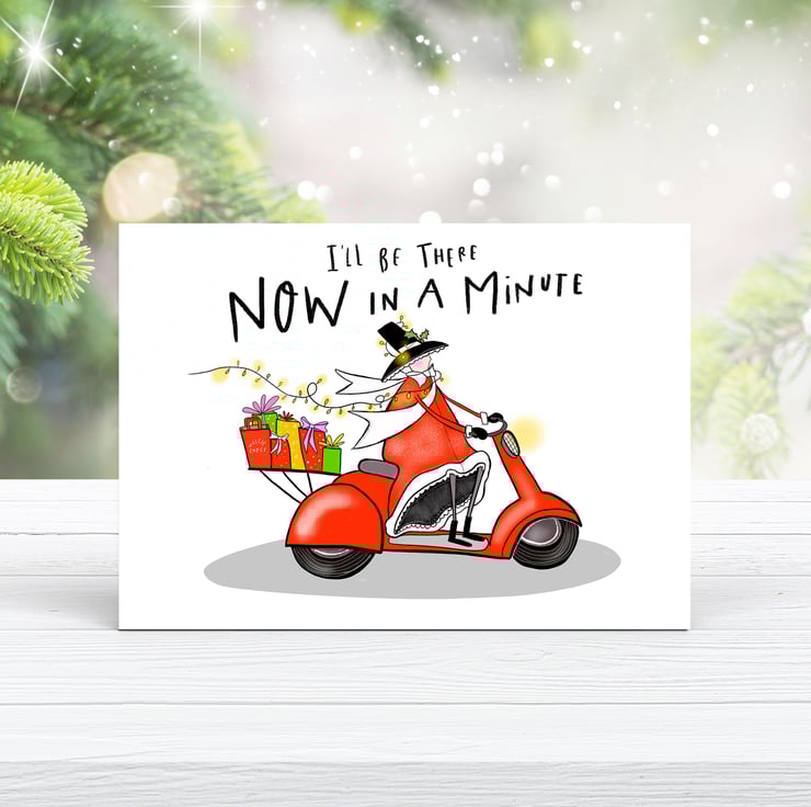 Send a laugh this Christmas with this Welsh Christmas card featuring a very merry cheerful Welsh lady racing off to spread festive cheer!