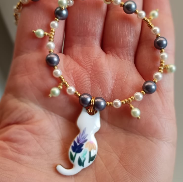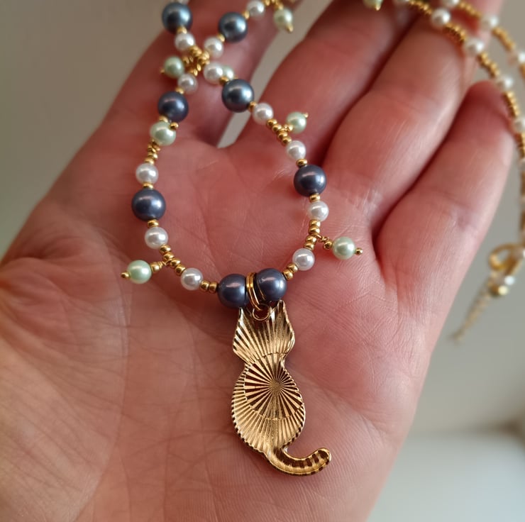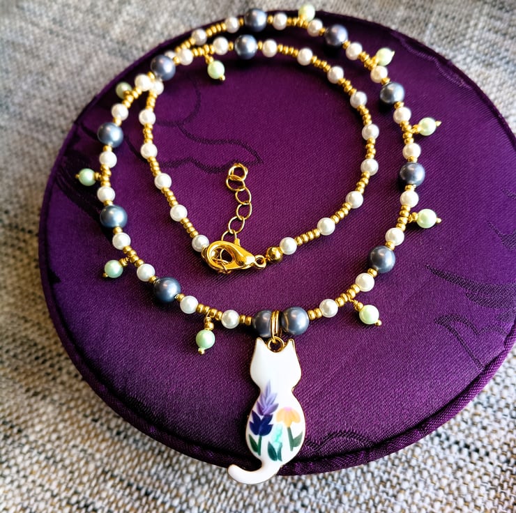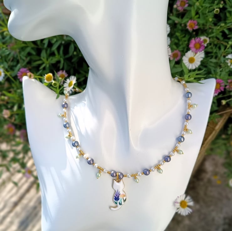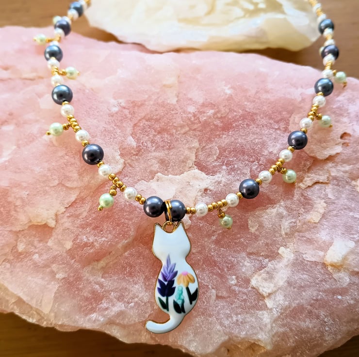 Add a touch of whimsical charm to your jewellery collection with this handcrafted multicolour shell pearl hand beaded necklace, featuring a delightful white enamelled metal cat pendant, adorned with floral detailing. The shell pearls are a beautiful pastel shade of lavender, mint and white highlighted against the golden glass seed beads. Necklace length 16 inches (41cm) adjustable to 18 inch (45cm) approx.