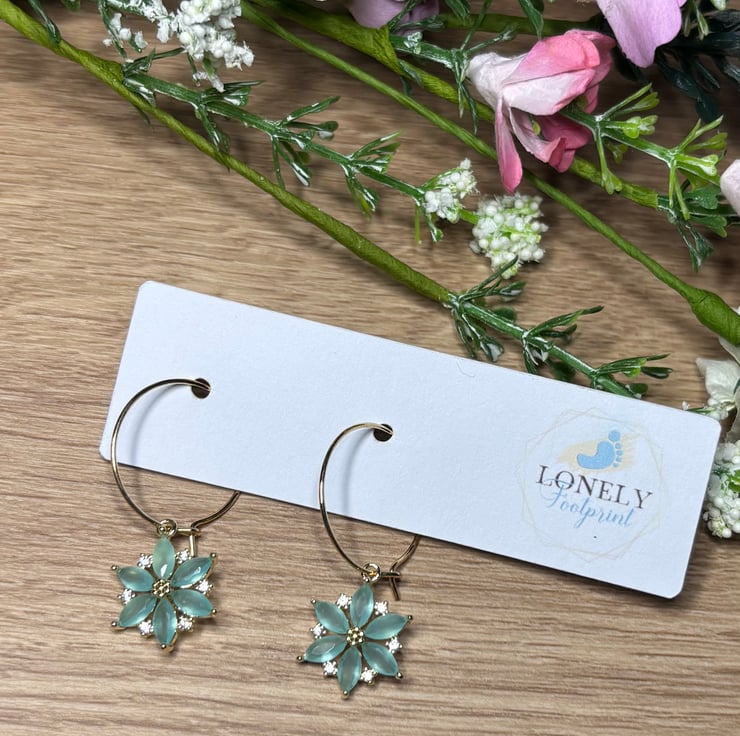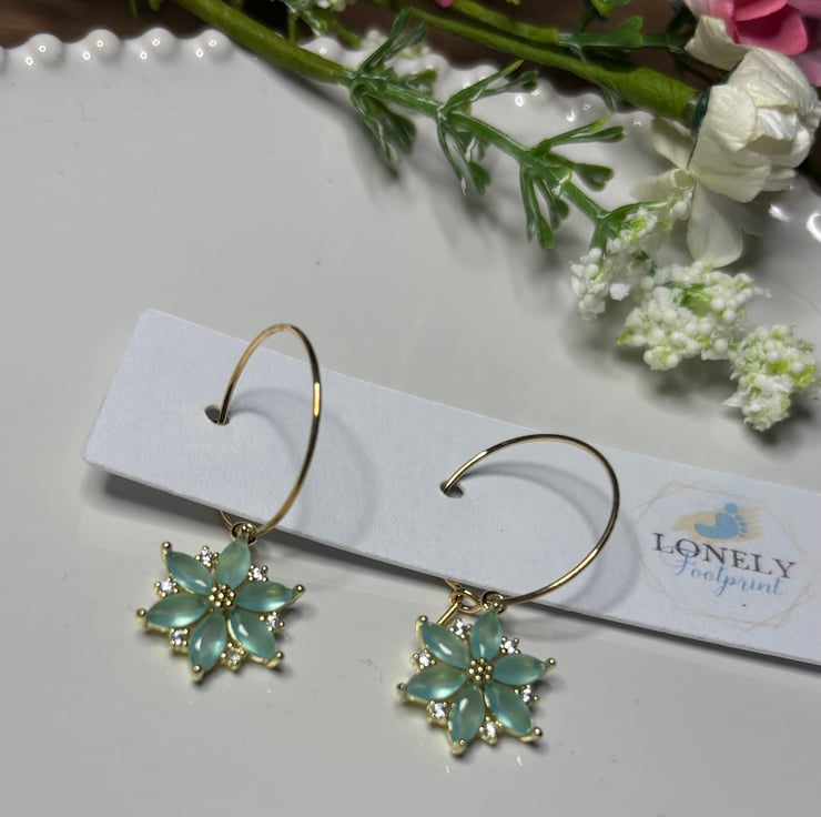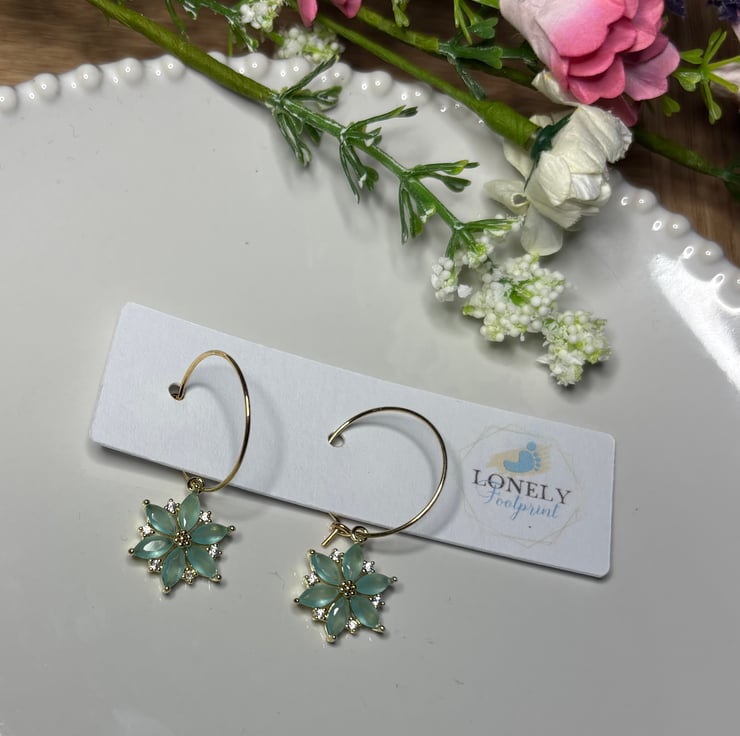 Pretty hoops with green crystal flower charms. Perfect for everyday wear or as a thoughtful gift.