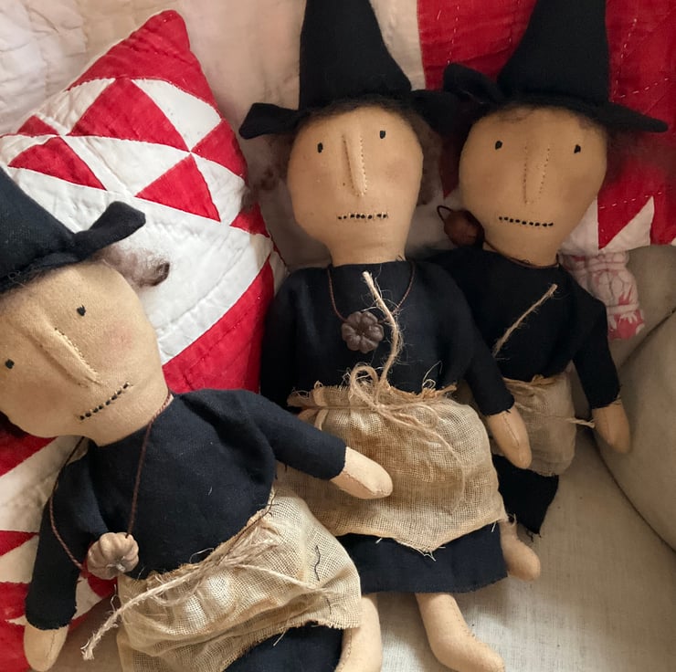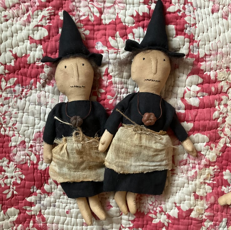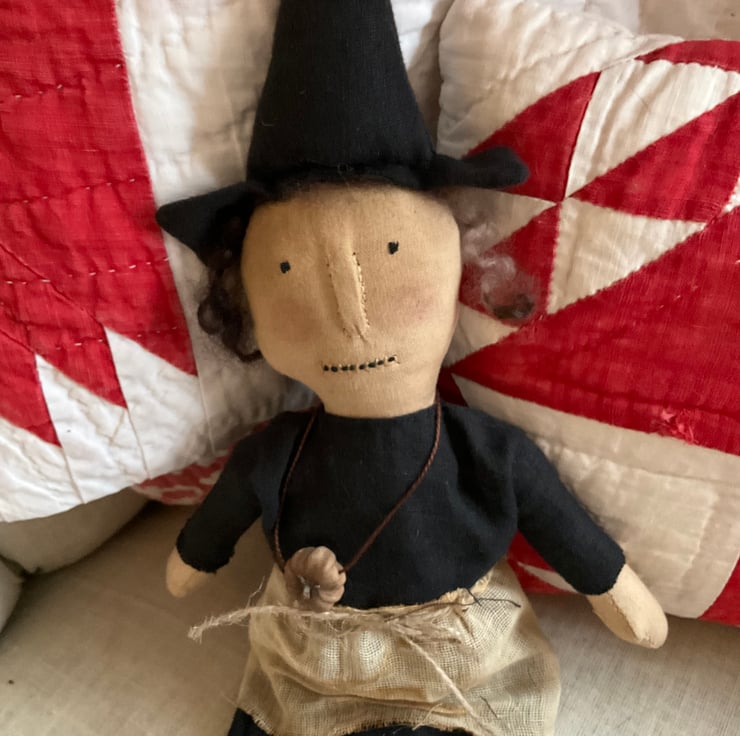 This adorable small primitive style witch is perfect for sitting on a shelf, or as part of an autumnal group display. Many of the edges have been left raw, so there may be some fraying, which is all part of the primitive look.