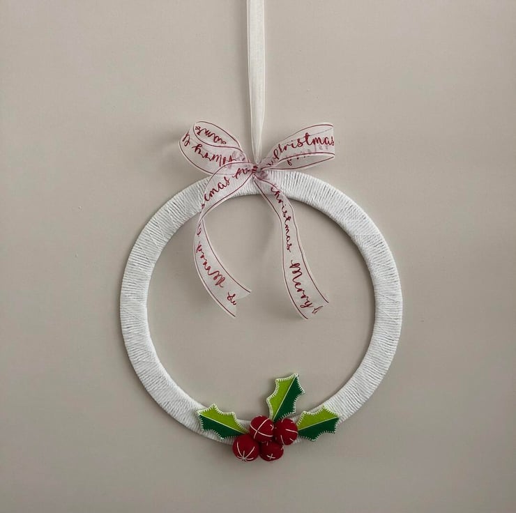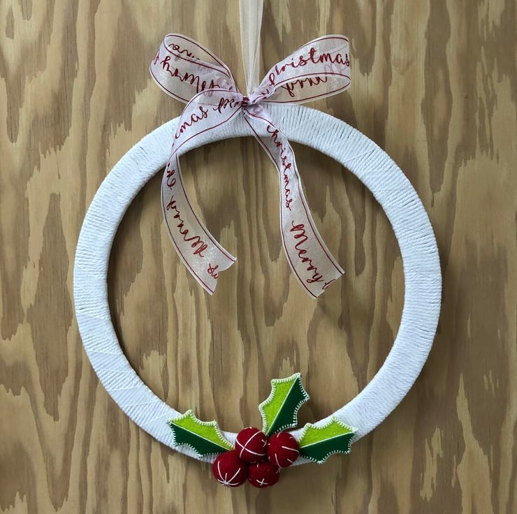 A beautiful wreath of felt holly berries in traditional red and green with handstitched detail. The wreath frame is a lightweight wood covered in white cord and ribbon and topped with a large Merry Christmas bow.