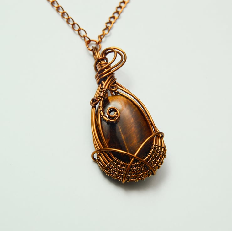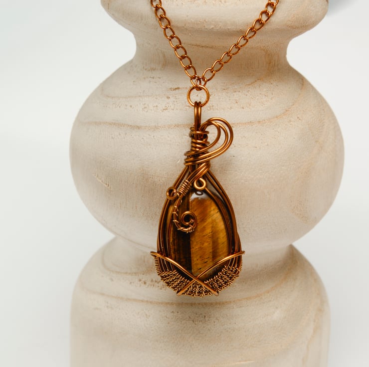 Wire-wrapped tiger’s eye pendants made of antique bronze are a beautiful combination of earthy gemstone energy and vintage metal aesthetics.