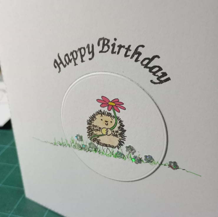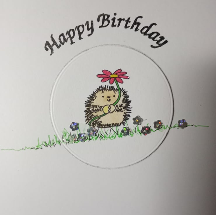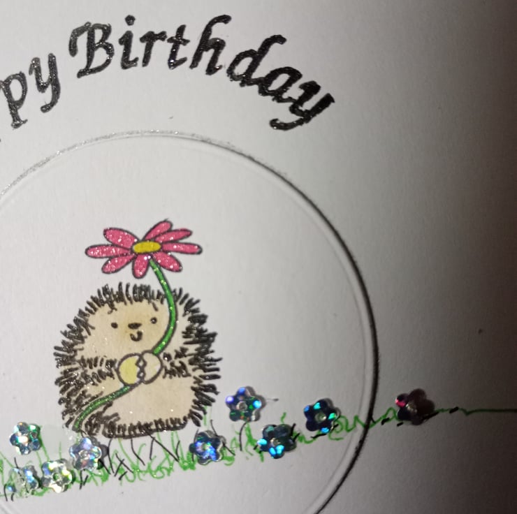 A completely handmade and uniquely designed card. Consisting of stamped image hand coloured and embellished with daisy sequins