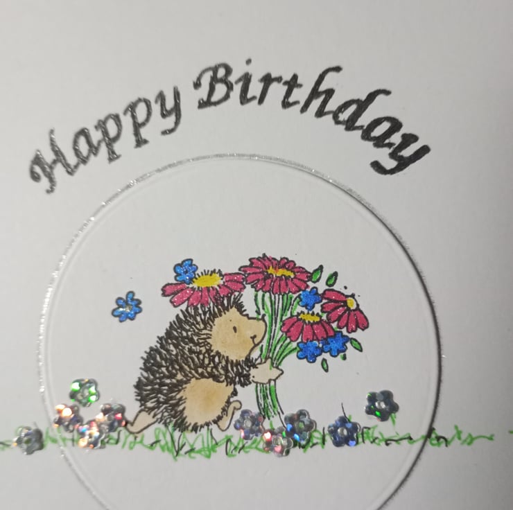 A completely handmade and uniquely designed card. Consisting of stamped image on quality pristine white card. Hand coloured and embellished with daisy sequins