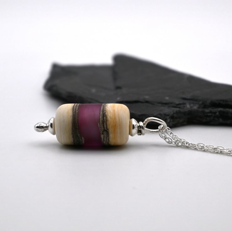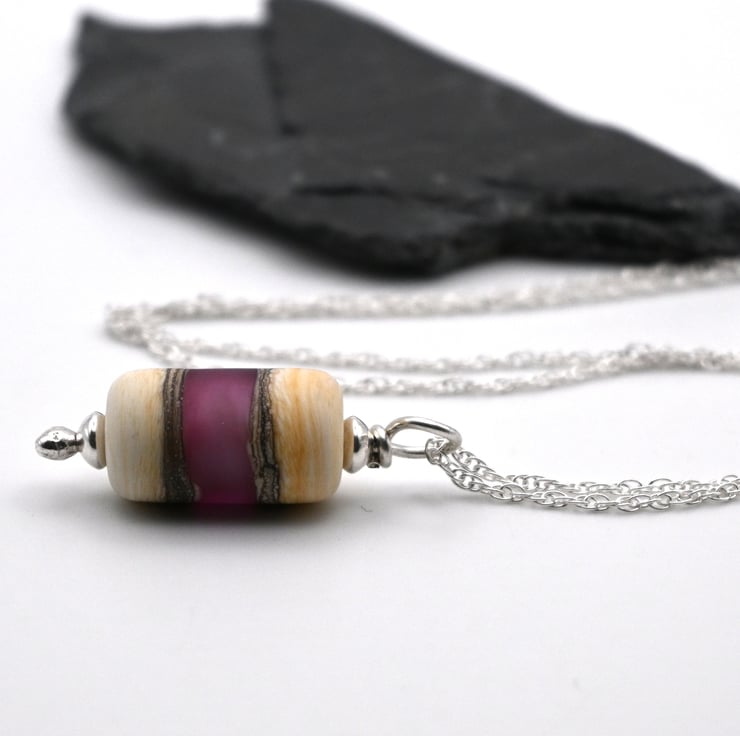 A sterling silver chain which features a handmade lampwork glass pendant.
