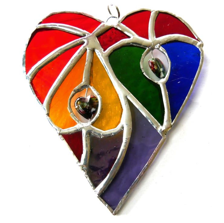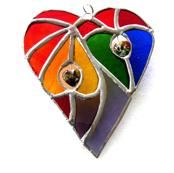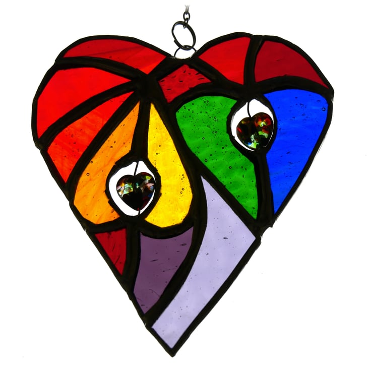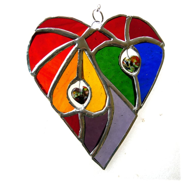 It is a big heart containing 2 smaller hearts cut from rainbow colours of orange, yellow, green and blue. These are surrounded by several different types of red glass plus some purple to make up the full specrrum.