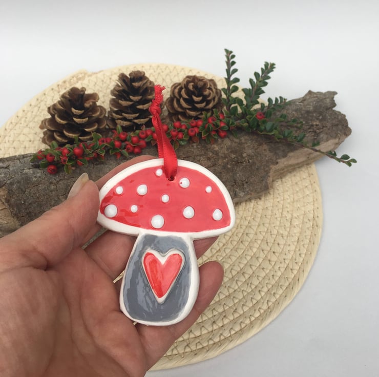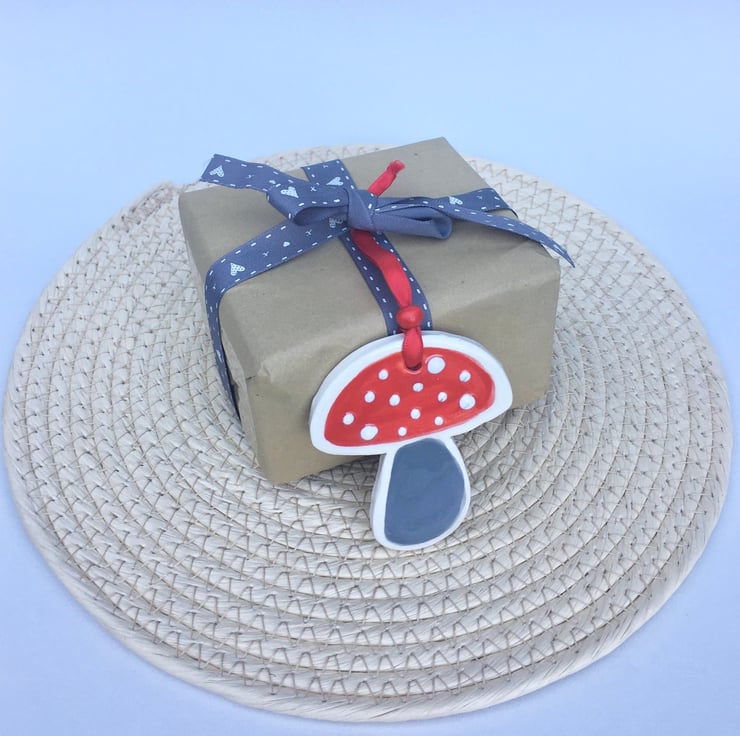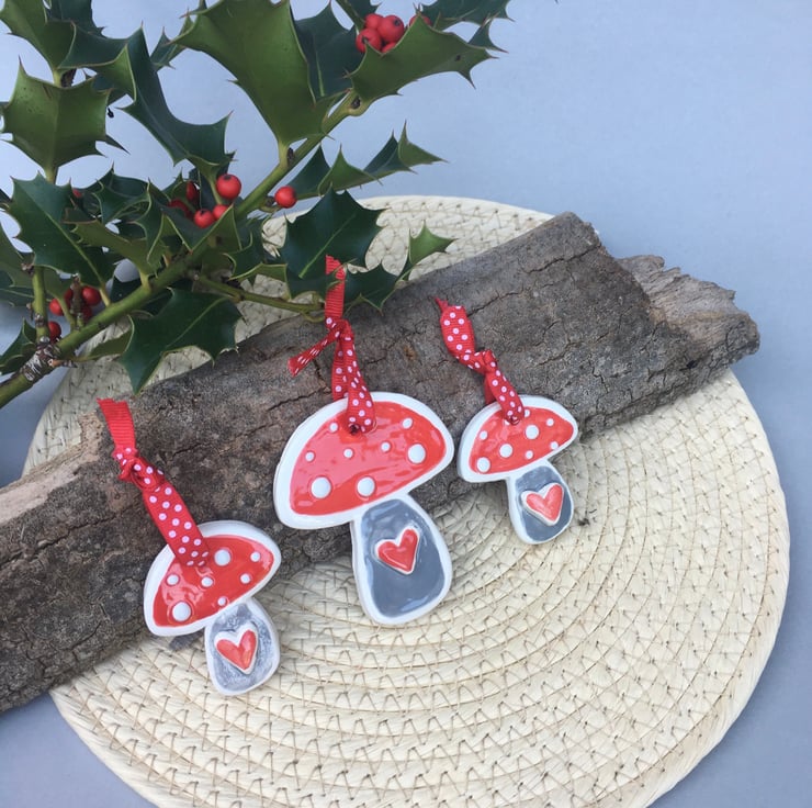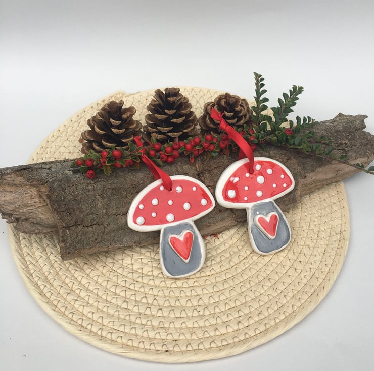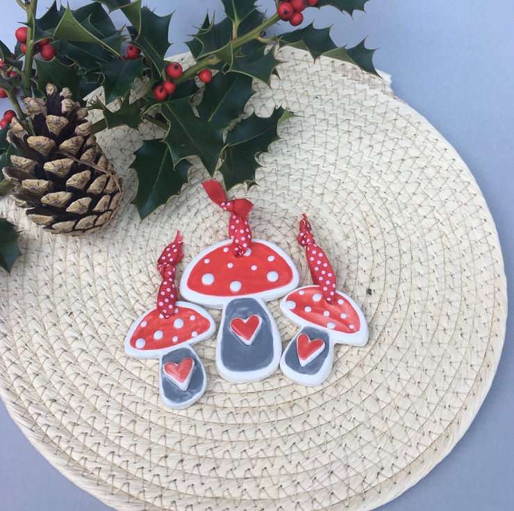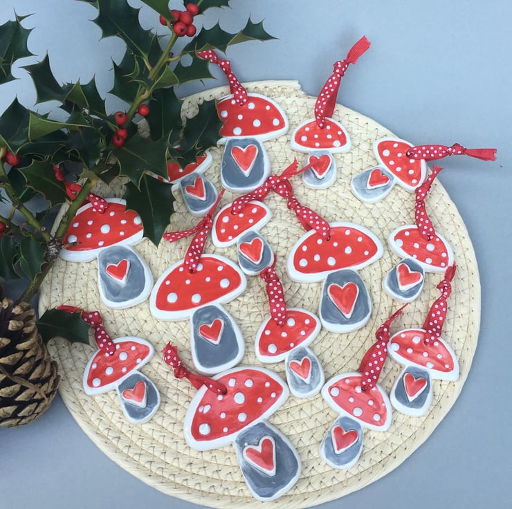 Handcrafted Ceramic Mushroom Christmas Tree Decorations. Folk Art Woodland Tag