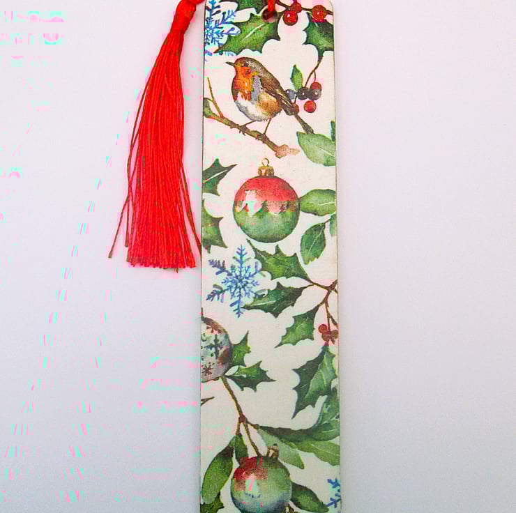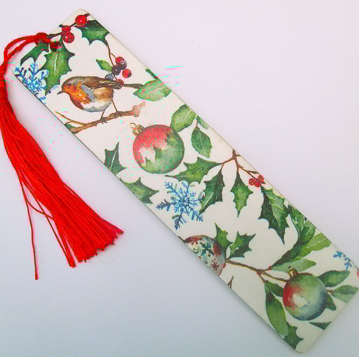 Robin and baubles Christmas wood decoupage bookmark with tassel