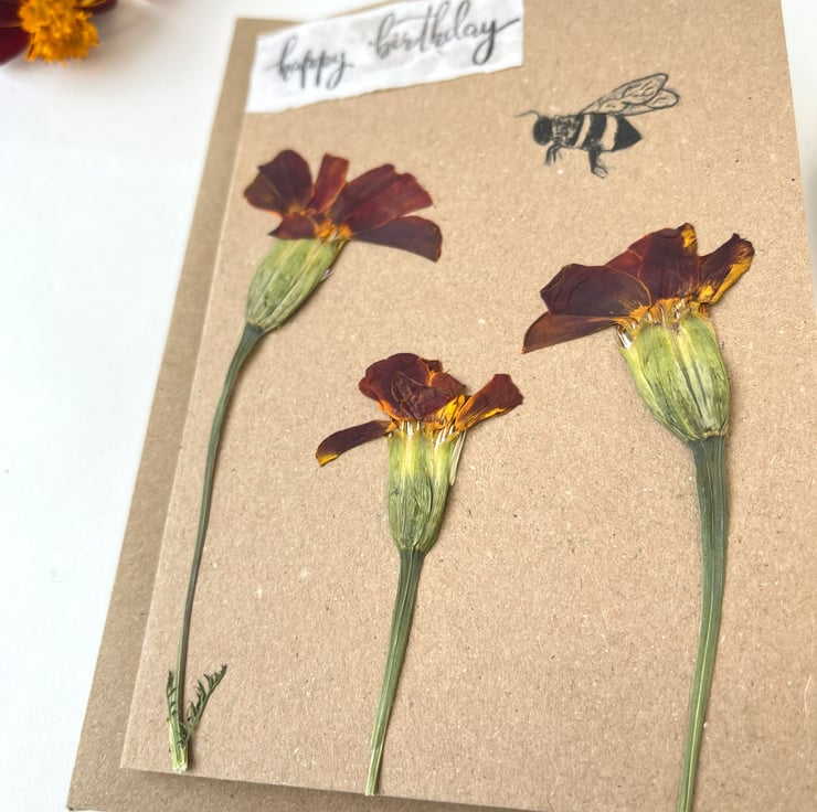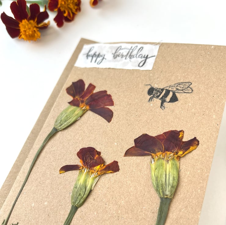 This lovingly handmade greeting card is made using real pressed marigolds grown from seed in our garden. The card is made from recycled kraft card and includes a hand drawn bee and happy birthday lettering stamped by hand.