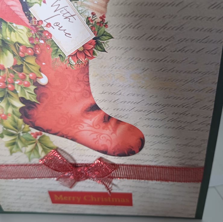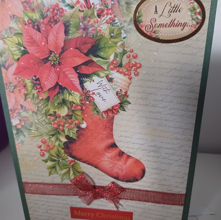 A green backing card with a stocking picture. Sparkly red ribbon to decorate