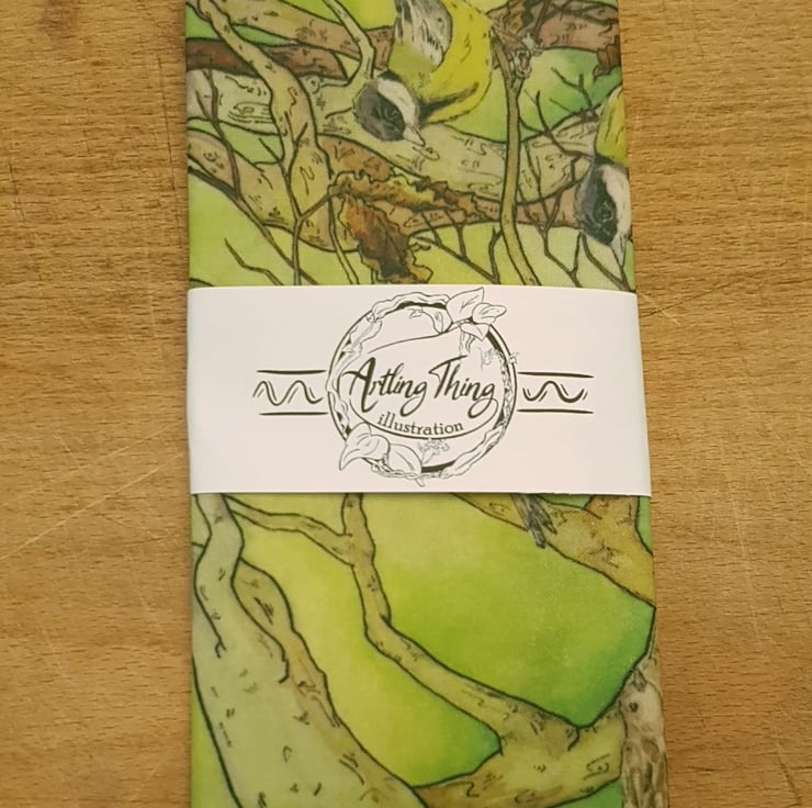 A Handmade Beeswax cotton wrap with small garden birds and twisted hedge design.