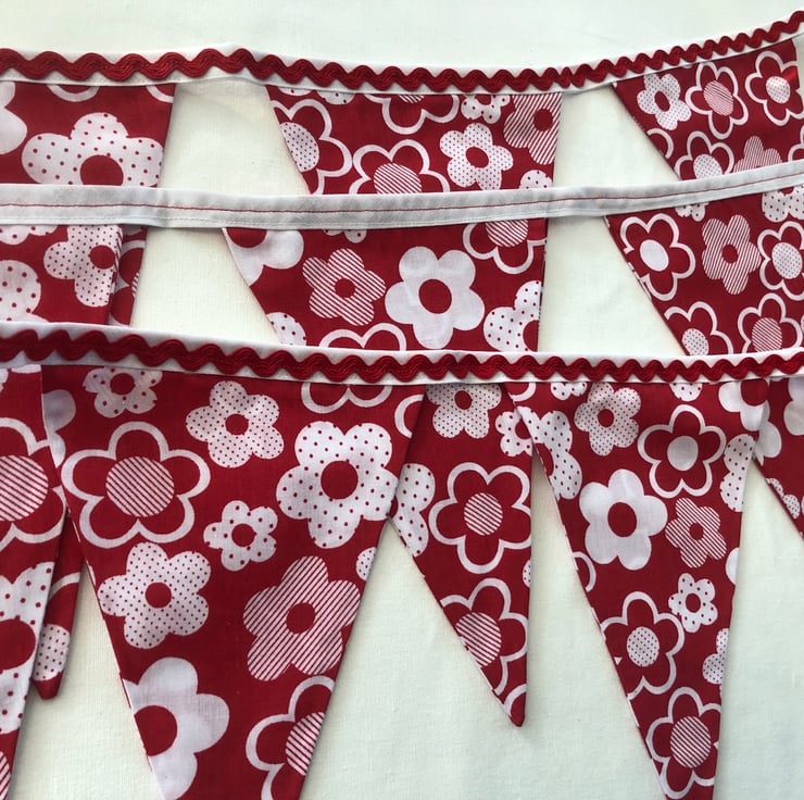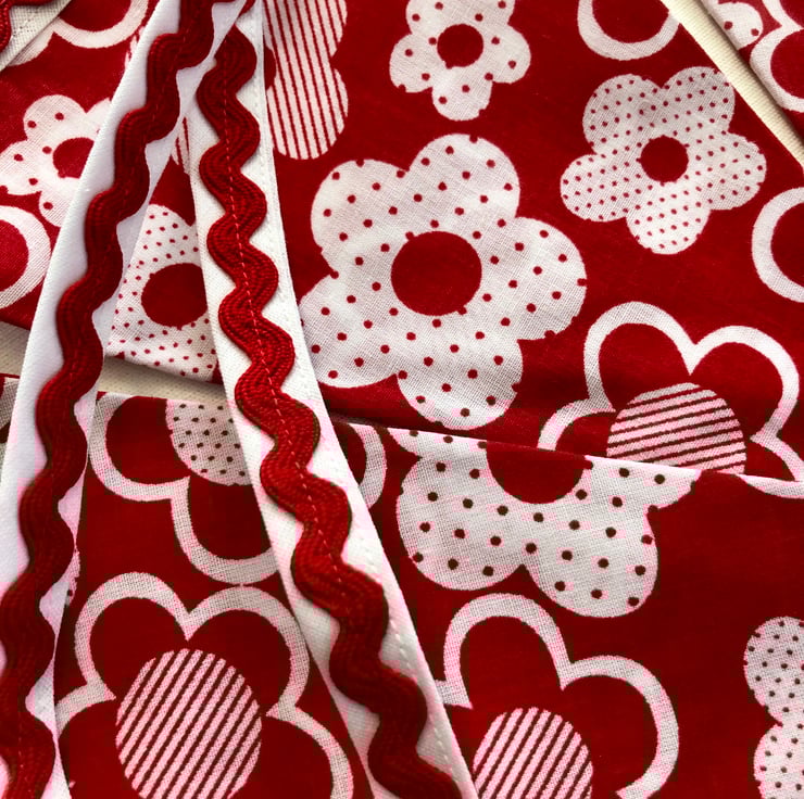 Bright and happy bunting featuring 13 cotton double sided flags made with bold 1970s style floral pattern fabric. Each flag measures 14 cm x 20 cm, and they are joined with white bias binding finished with a red wavy trim for a playful touch. Total length from end to end is 2.94 metres.