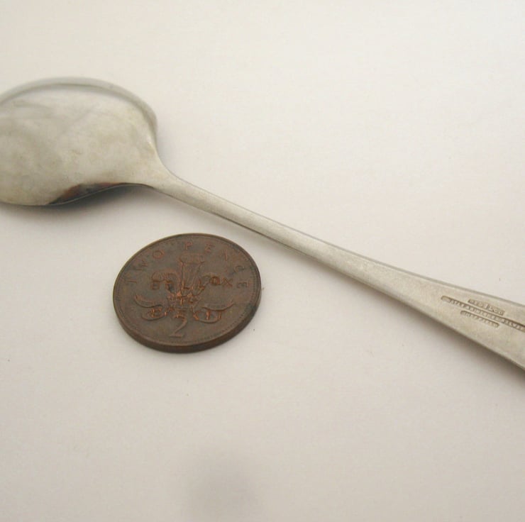 Please note this is a vintage spoon (I think it's 1940s to 1950s) so it does have scratches and wear marks although these in no way affect its functionality as a spoon and it is honestly shinier than my photos make it look. And as it's alloy rather than silver-plated, it's always going to have that wartime look, there's a slightly brassy tint to it no matter how much you polish it. I have reduced the price to a fiver and put it in the bargain bin anyway.