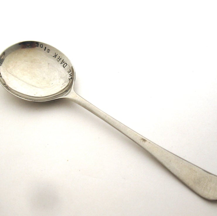 A hand stamped vintage nickel silver alloy fruit spoon with the words 'THE DARK SIDE' inside one edge of the bowl and the words 'OF THE SPOON' inside the opposite edge. It's a plain 'old english' style spoon measuring approximately 14cm long. Great for ice cream, puddings, or as a small soup or cereal spoon.