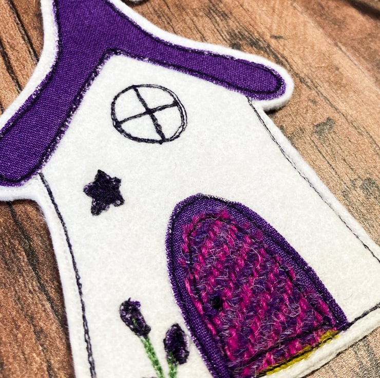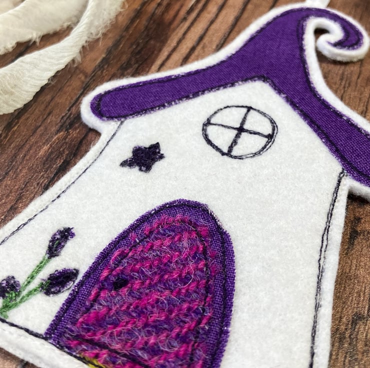 The stitching details are created by freehand machine, free motion embroidery incorporating fabric applique, including a Harris Tweed Fairy Door