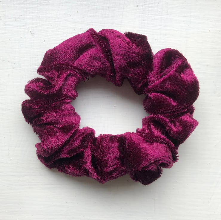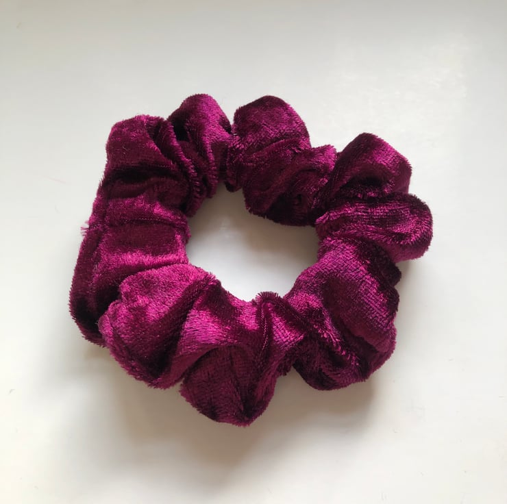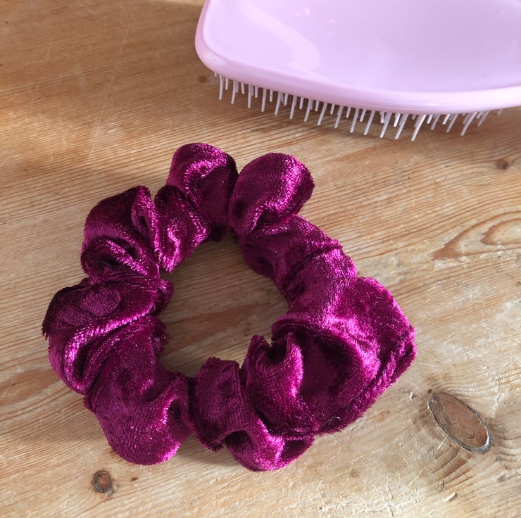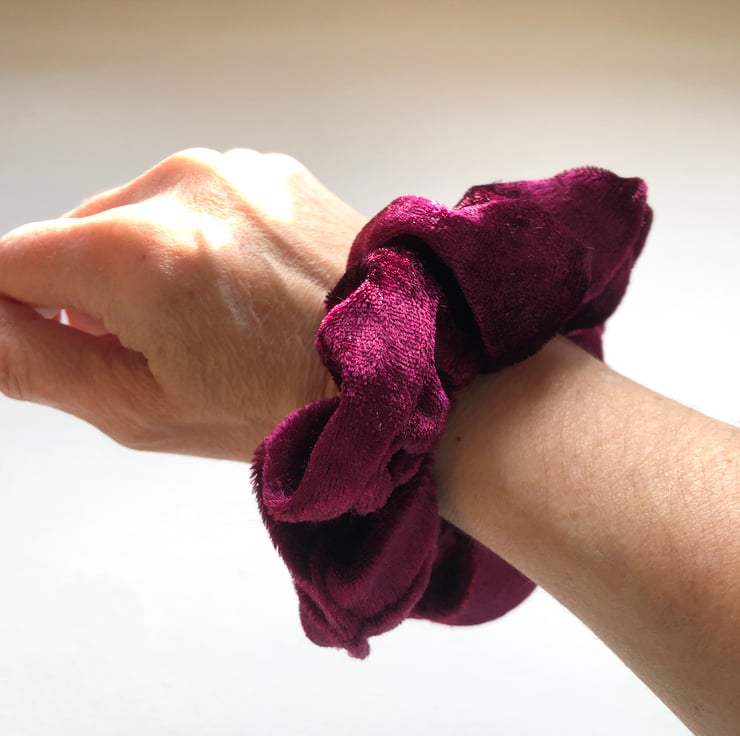 I have made these pretty scrunchies from crushed red velvet material in a lovely deep berry colour. They are sumptuously soft and luxurious feeling.