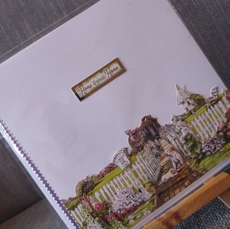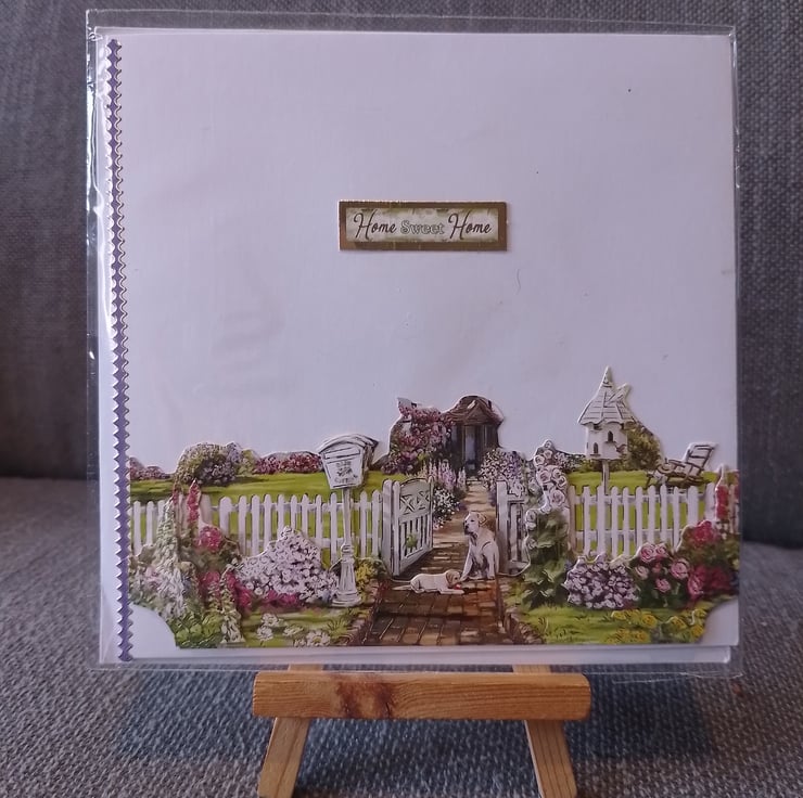 A 6" birthday card showing a garden scene with the pets, all cards come with matching envelopes and are cellophane-wrapped to keep clean, has a home sweet home greeting, ideal for a new home