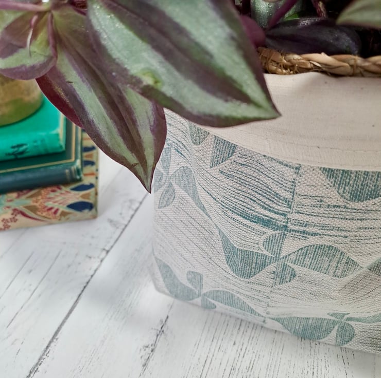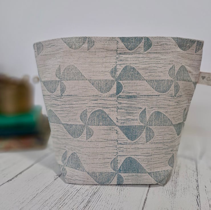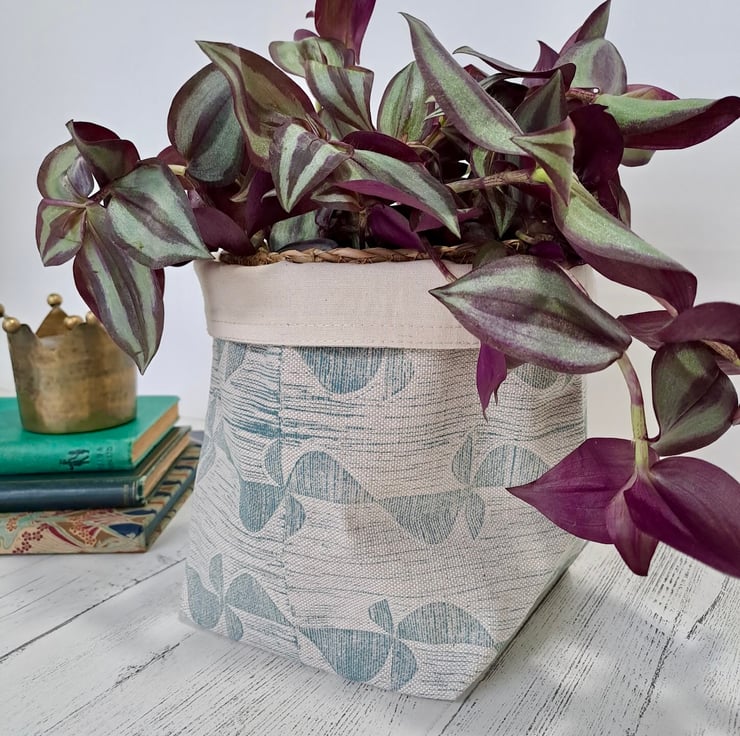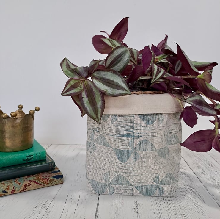 This unique design is block printed by hand using Eco-Friendly inks on to natural Linen Union fabric woven in Scotland. The lining is 100% cotton calico. The top can be folded down or left standing up for more storage