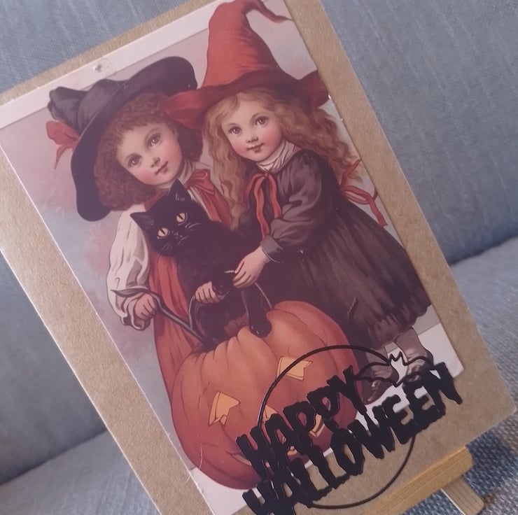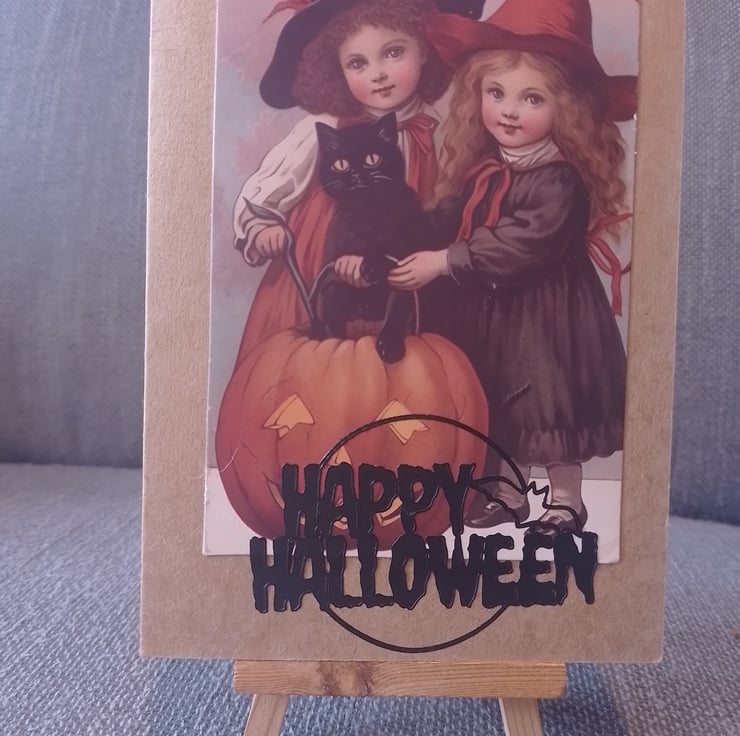 A 7 x 5 " card showing 2 girls with their pumpkin at Halloween, all cards come with matching envelopes and are cellophane-wrapped to keep clean