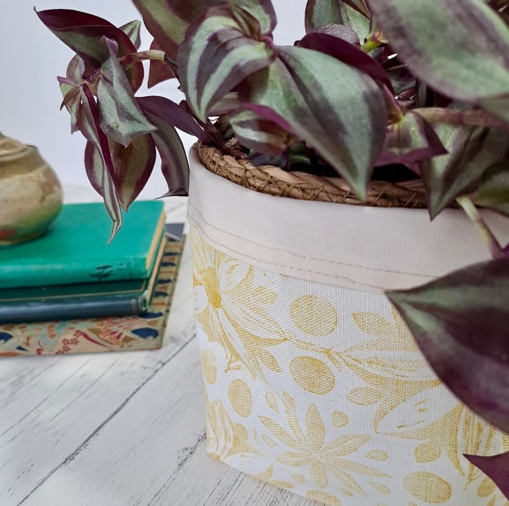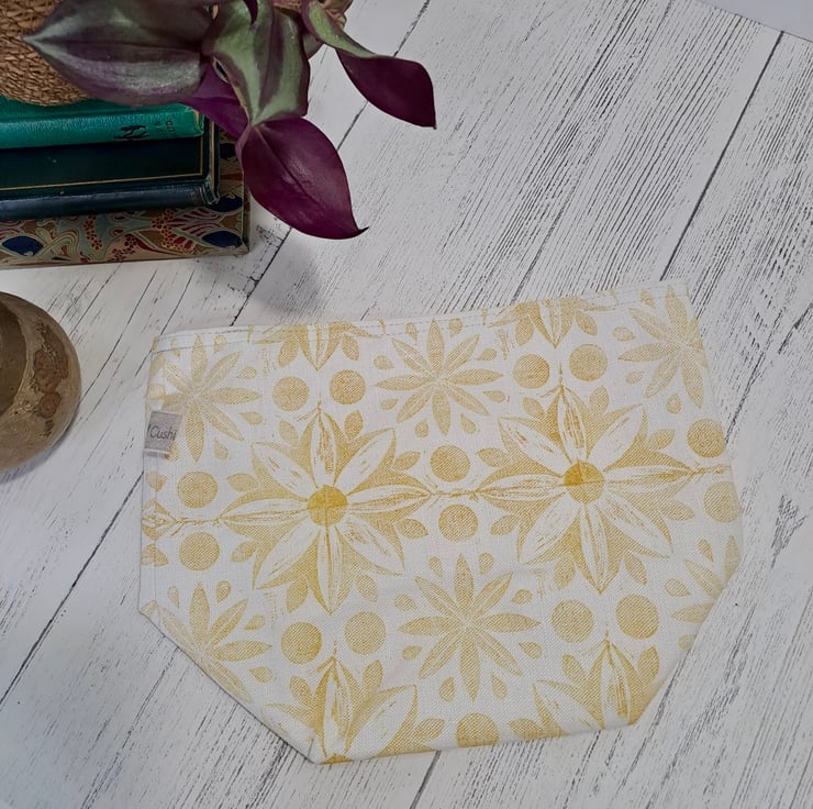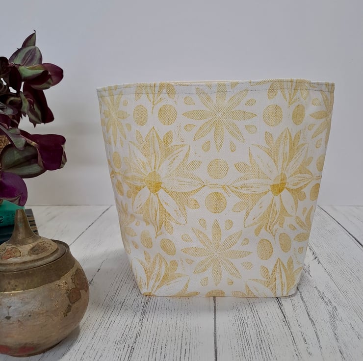 This unique design is block printed by hand using Eco-Friendly inks on to natural Linen fabric woven in Scotland. The lining is 100% cotton calico. The top can be folded down or left standing up for more storage