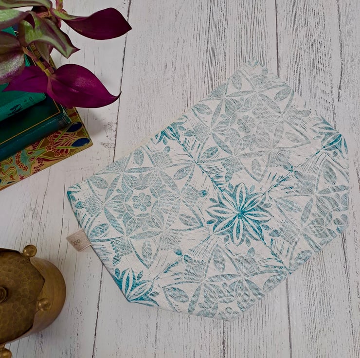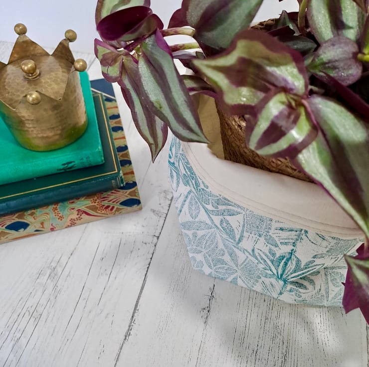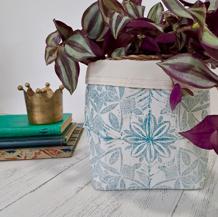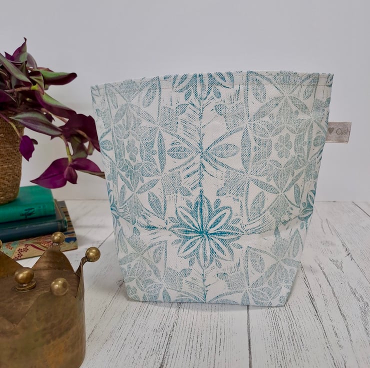This unique design is block printed by hand using Eco-Friendly inks on to natural Linen fabric woven in Scotland. The lining is 100% cotton calico. The top can be folded down or left standing up for more storage