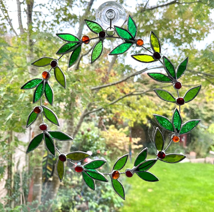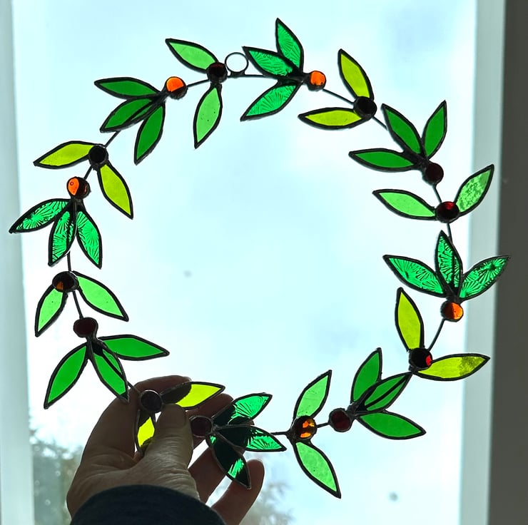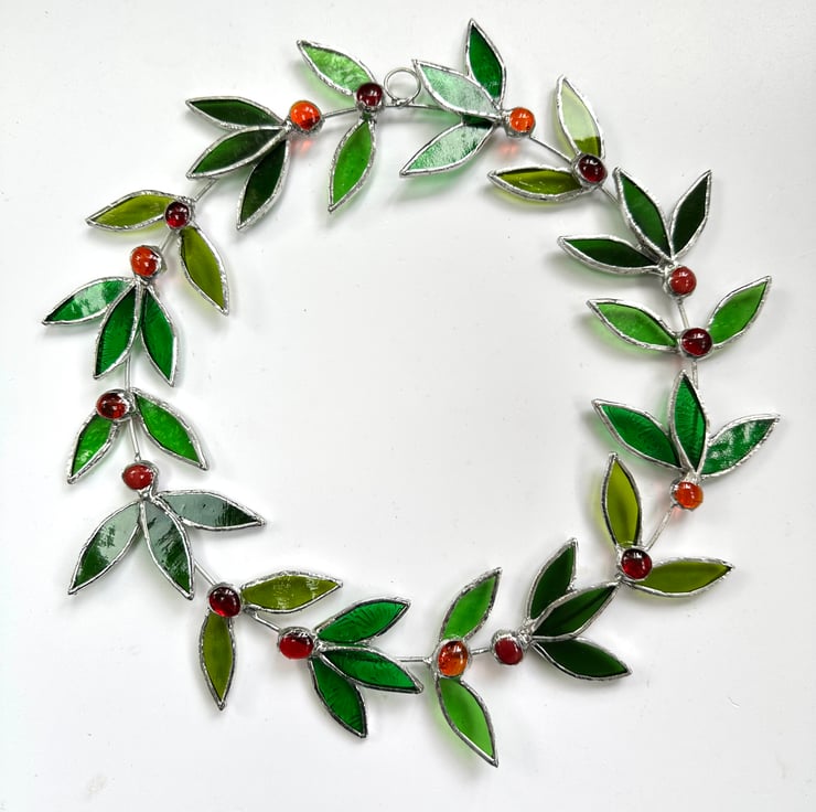 This wreath has been made up from 40 laurel leaves made from 4 different types of green stained glass and 16 red and orange berries.