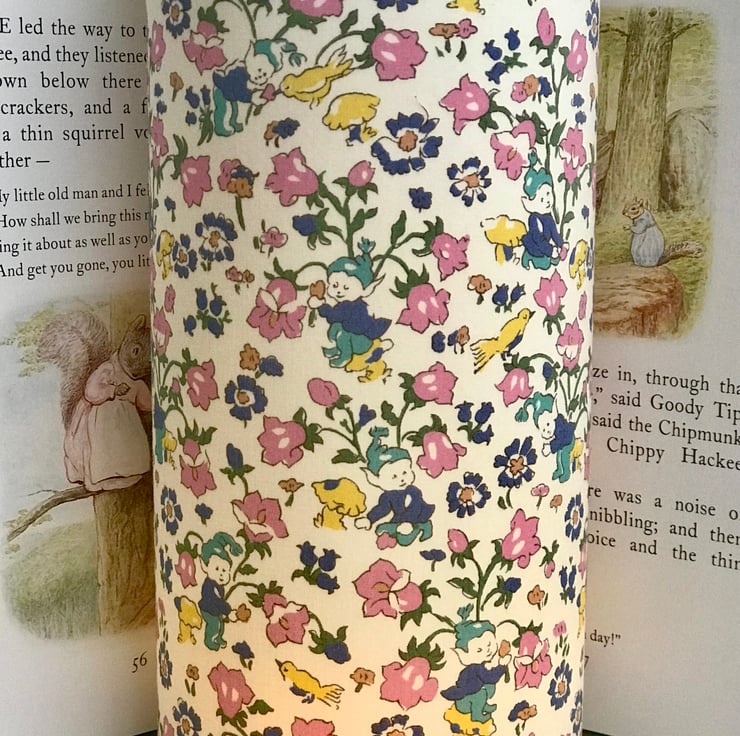 Such a delightful Children's Liberty print featuring, Bluebells, dew kissed Daisies amongst a magical meadow, with mischievous Pixies and tiny birds, this whimsical Night Light looks simply lovely lit up.