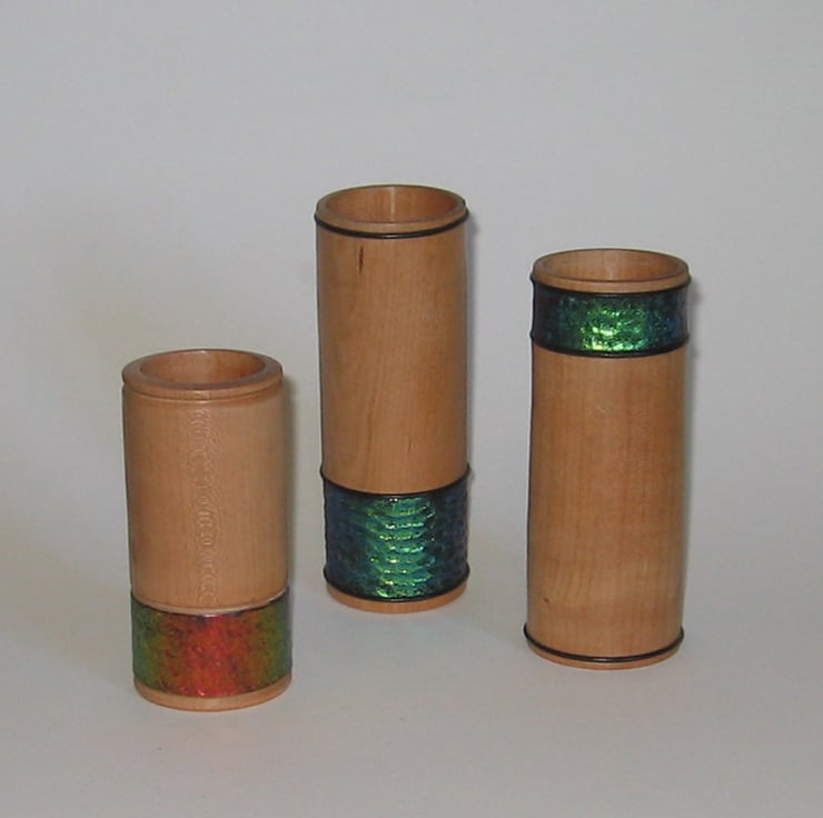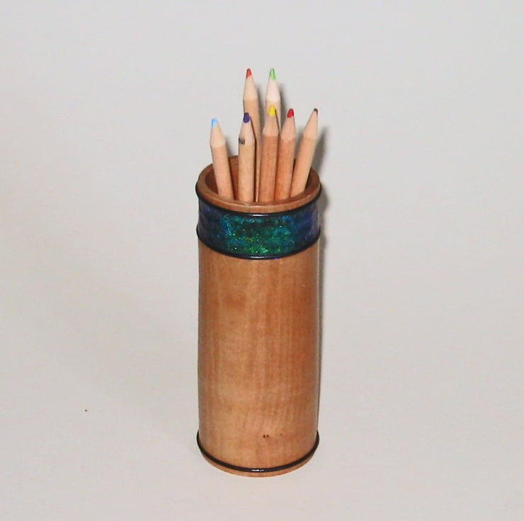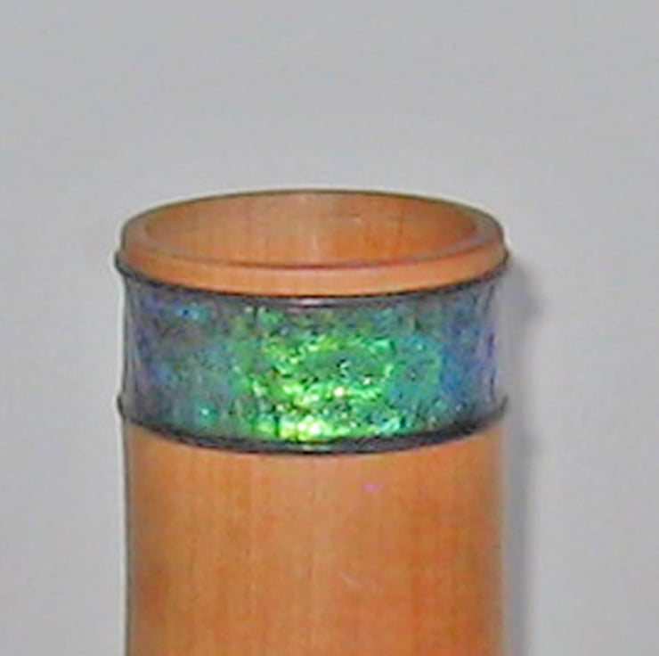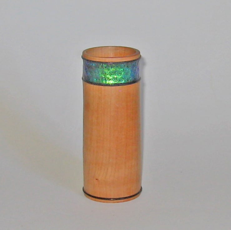 This brush pot is one of three I recently turned. The wood is cherry that has been carved and decorated with flakes to give an iridescent aspect. The colour changes according to the angle it is viewed from. A further embellishment is the use of black leather banding. The pot has been given a hard wearing wax finish in addition to a lacquer that was applied to fix the flakes.