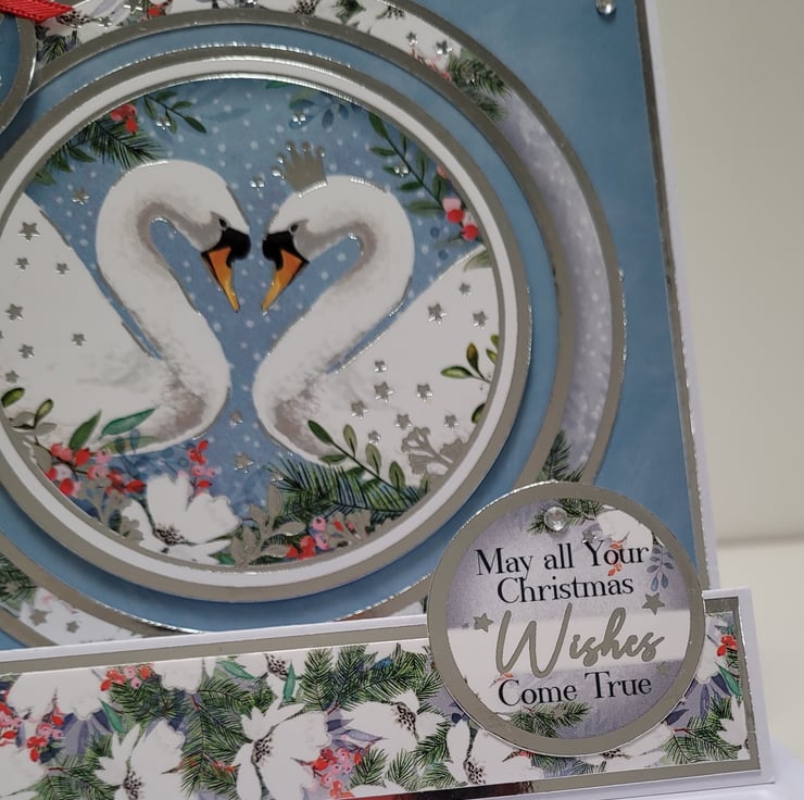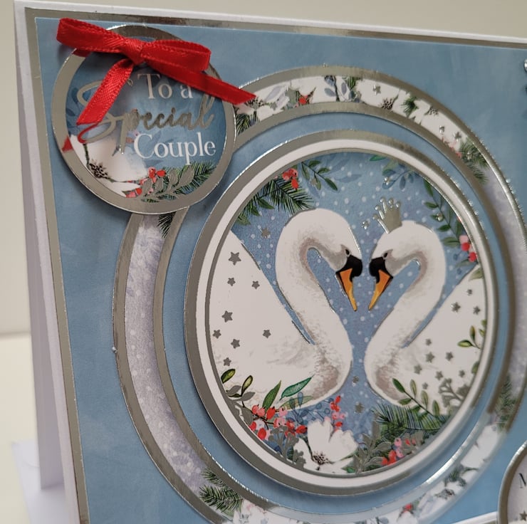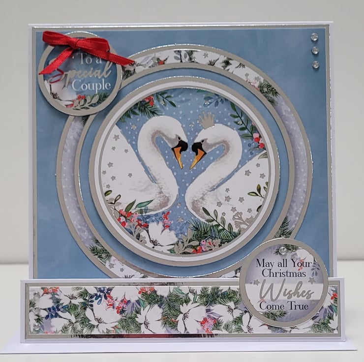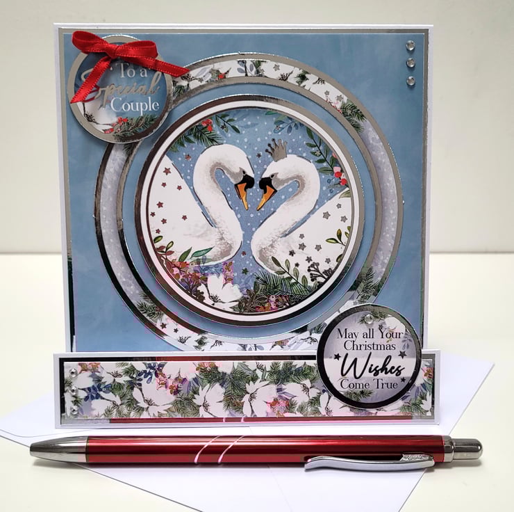 Finished with a small coordinating red ribbon and small diamante rhinestones, as well as two silver foiled sentiments which read "To a special couple" and "May all your Christmas wishes come true".