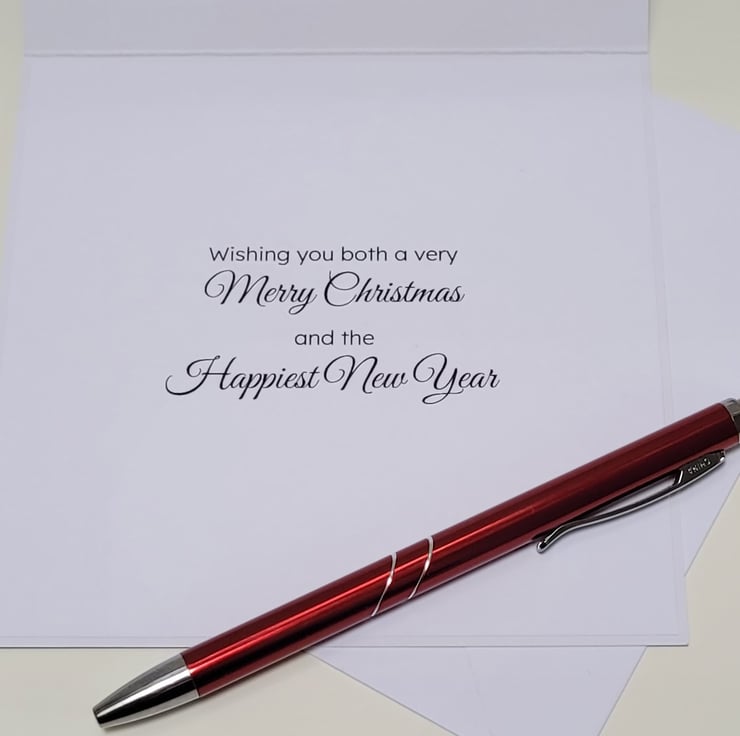 The card measures 5 x 5 inches (13 x 13 cm), contains a sentiment on the inside which reads "Wishing you both a very Merry Christmas and the happiest New Year", and is supplied with a plain white envelope.