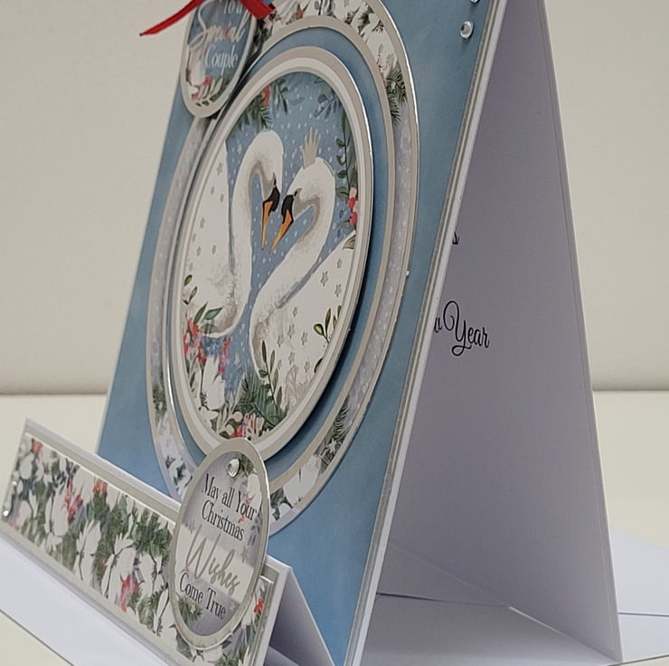 Featuring a beautiful pair of swans (one wearing a silver crown) surrounded by festive foliage, this front step shaped card is a wonderful way to send Christmas wishes to a special couple.