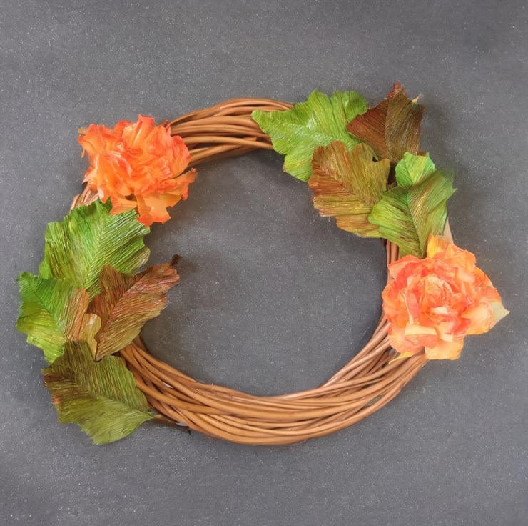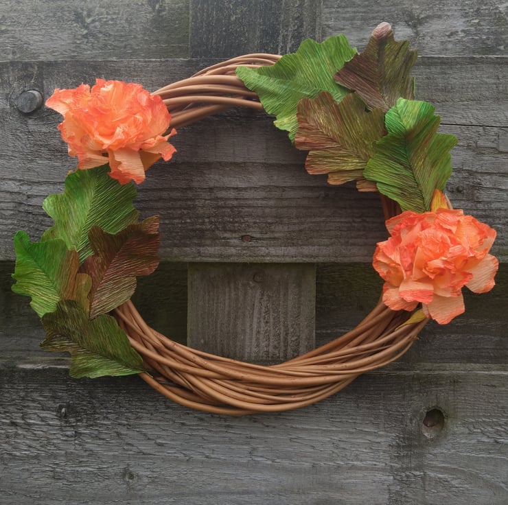 A wreath handwoven by me from buff willow and decorated with Autumn leaves and marigold flowers made by me from crepe paper. The flowers and leaves are hand painted and assembled on wire. There is only one of this one of a kind wreath available. It measures about 26cm across and can be hung on a nail or screw or I can add a hanging ribbon if you prefer. Please note that as the decorations are made from crepe paper, this wreath is only suitable for indoor use and is best kept out of direct sunlight. Sent with FREE UK POSTAGE.