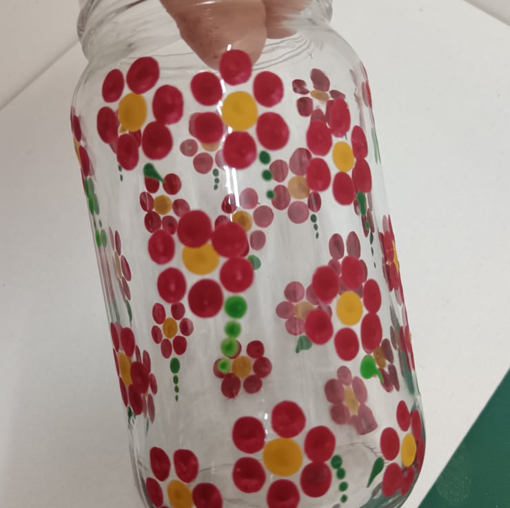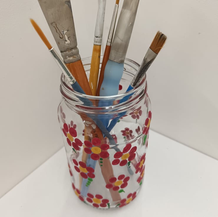 This glass jar has been repurposed and hand-painted by me to use as storage (pens, buttons, cottonwool, paperclips, flowers)