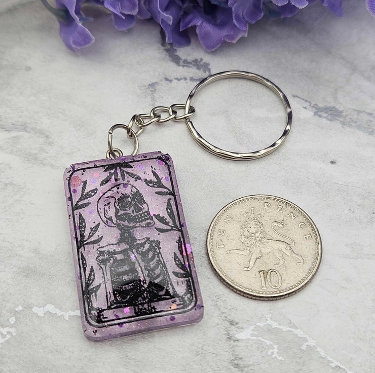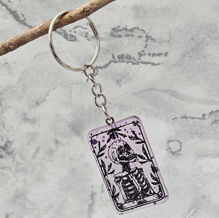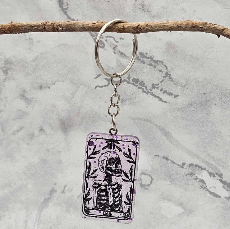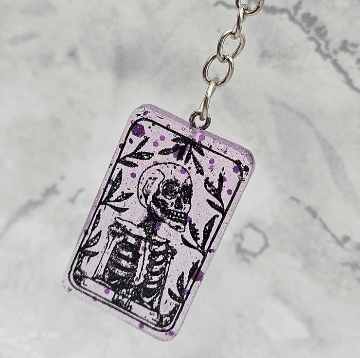 Bring a touch of mystic charm wherever you go with this handmade Death Tarot Card Keychain. Inspired by classic tarot symbolism, this keyring features a striking skeleton design set in a transparent purple resin, the perfect balance of dark and ethereal.