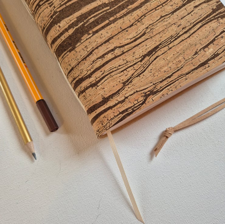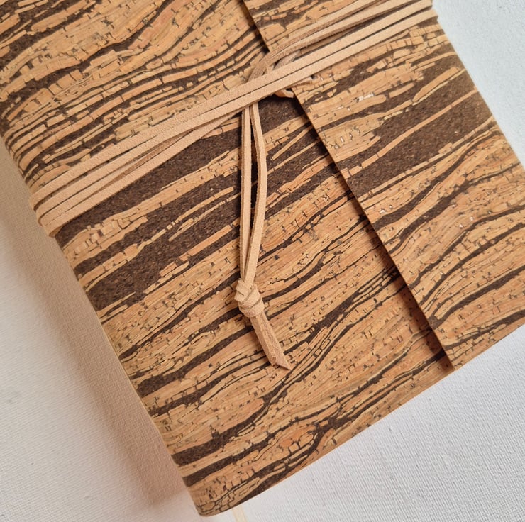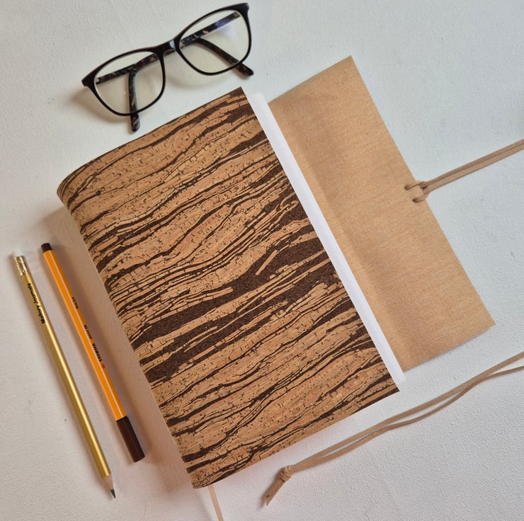 The Cork is a gorgeous soft and very tactile fabric, perfect for soft cover Journals. The Journal is closed with a faux suede fabric wrapped around and tucked in.