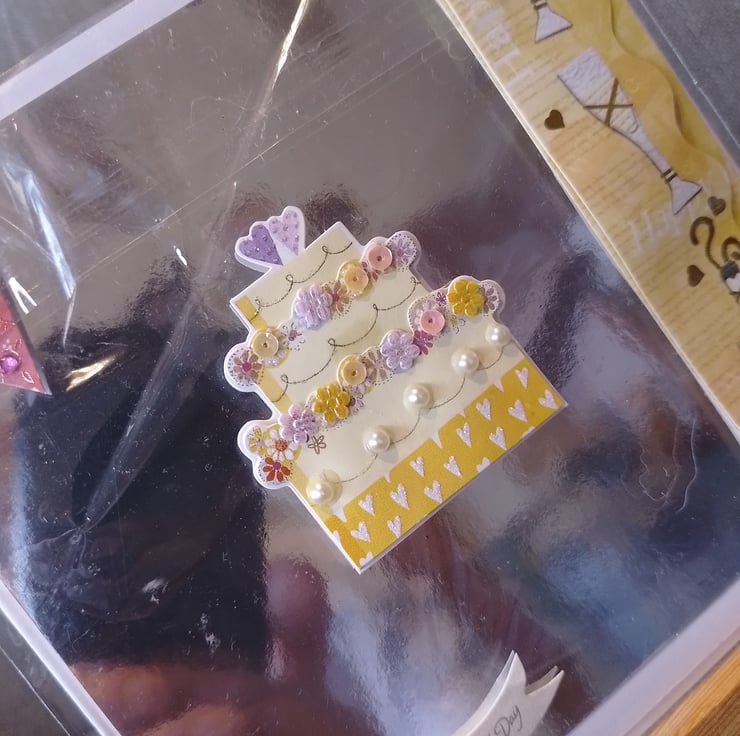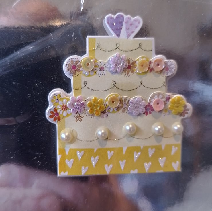 A 6"sq card showing a wedding cake, all cards come with matching envelopes and are cellophane-wrapped to keep clean. Mirror silver backing with a pretty border displays a decorative cake plus other embellishments. It has a on your special day greetings banner