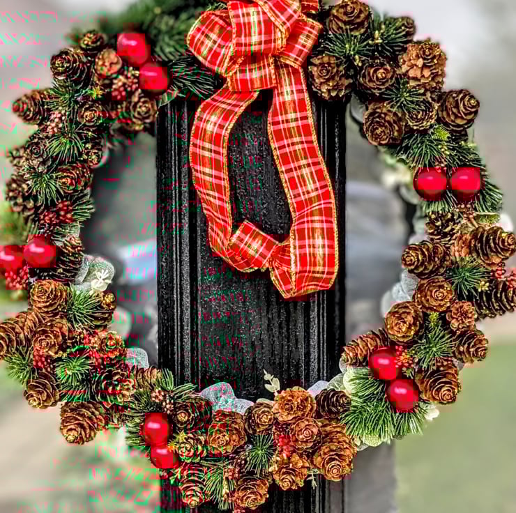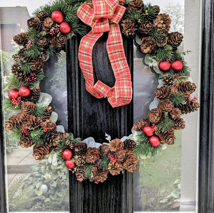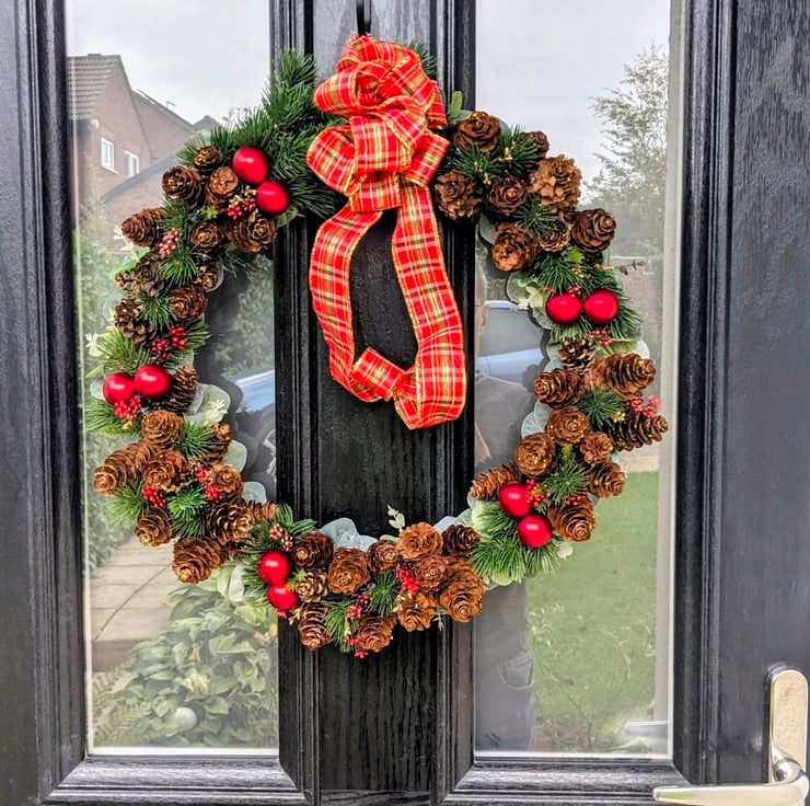 This beautiful 50cm traditional festive pine cone & red baubles Christmas Door Wreath, is a handcrafted with artificial fir tree & eucalyptus, perfect for adding a touch of Christmas cheer to your door.