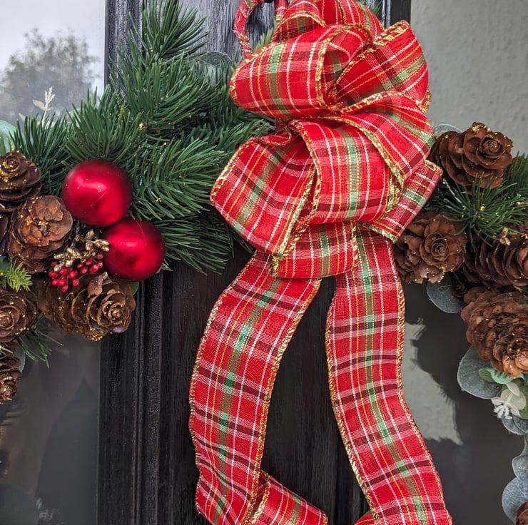 The bright red, green & gold colour ribbon bow and festive decorations make it a beautiful addition to your seasonal decorations, bringing a traditional and charming feel to your home.
