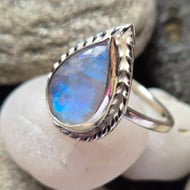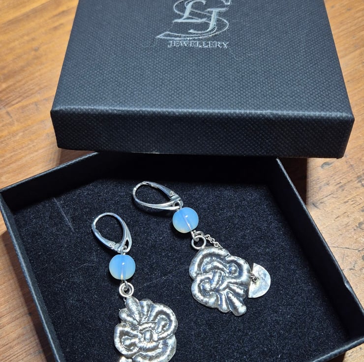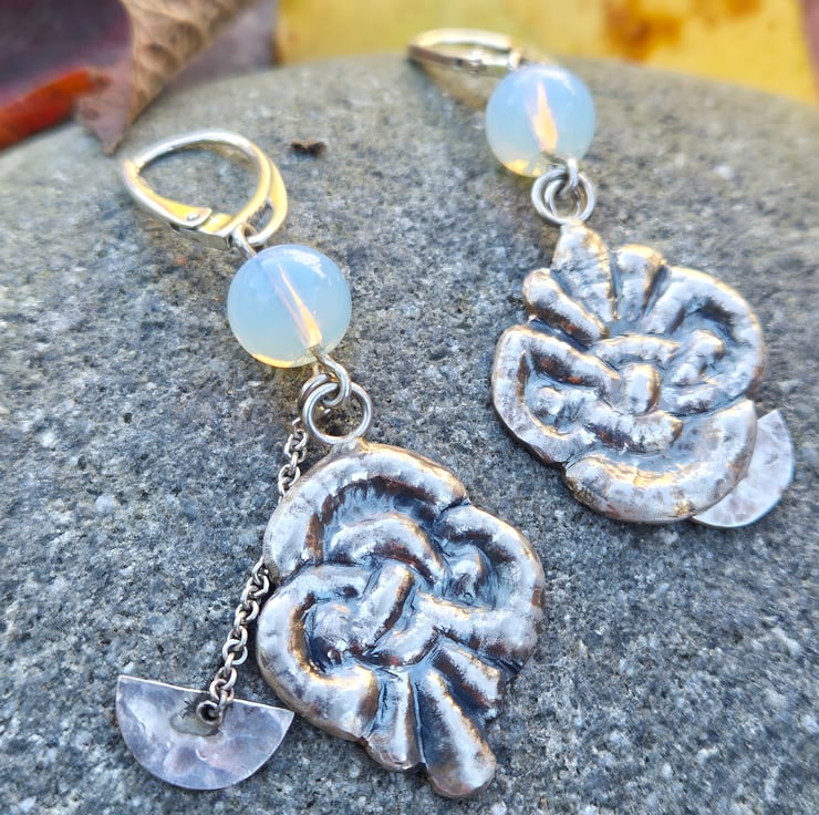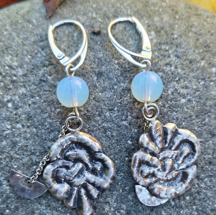 Celtic art inspired handmade out of fine silver with sterling silver details and beautiful moonstone beads. Earings made from scratch using chase and repousse technique. Earings has a little dangly detail which makes subtle and nice noice. Reminds of the wind bells.