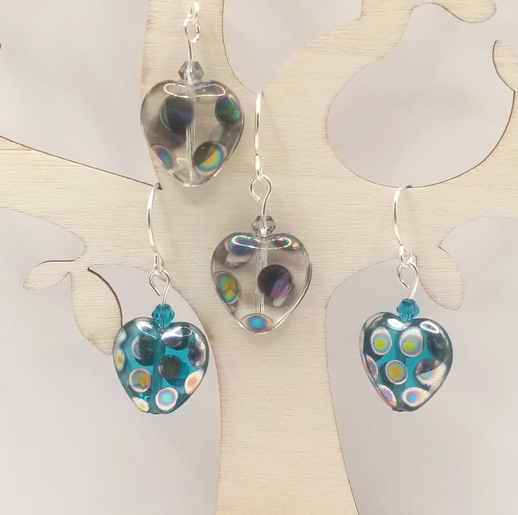 Hand made using 16mm heart shaped Czech glass beads with a metallic or matt peacock coating topped off with a 4mm crystal glass bicone bead.