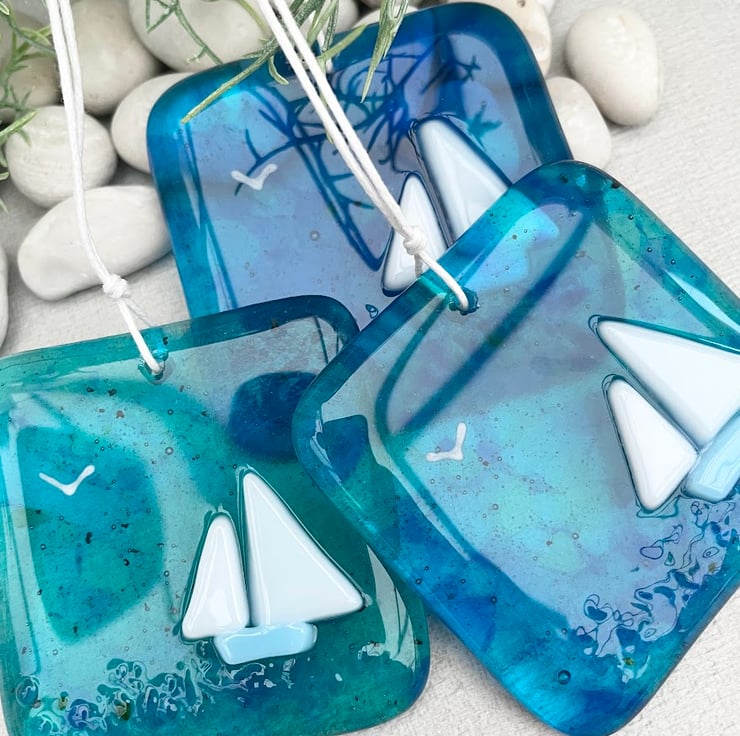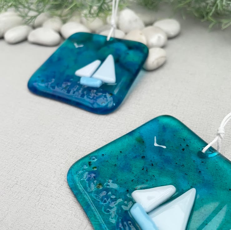 A single sailing yacht, on a square of cool turquoise glass, fab for a beach hut or seascape theme.