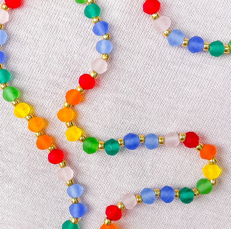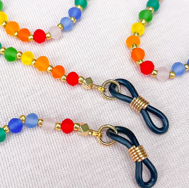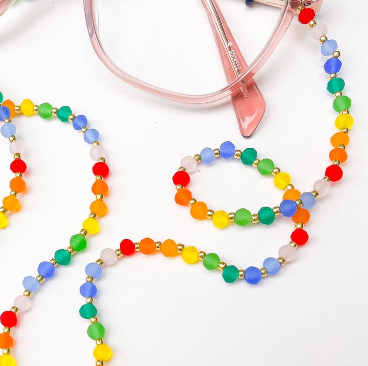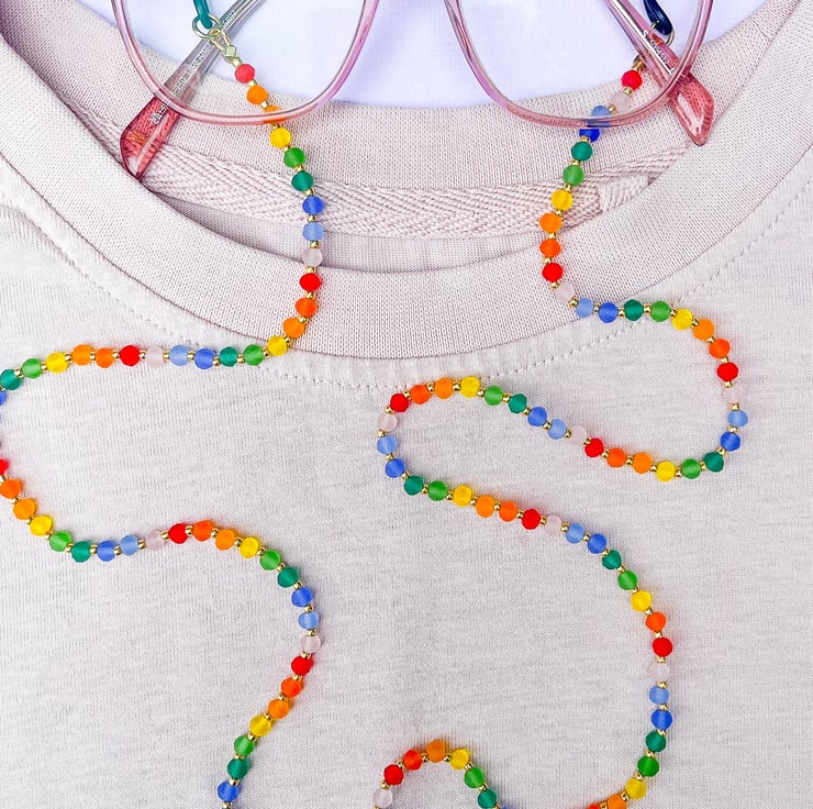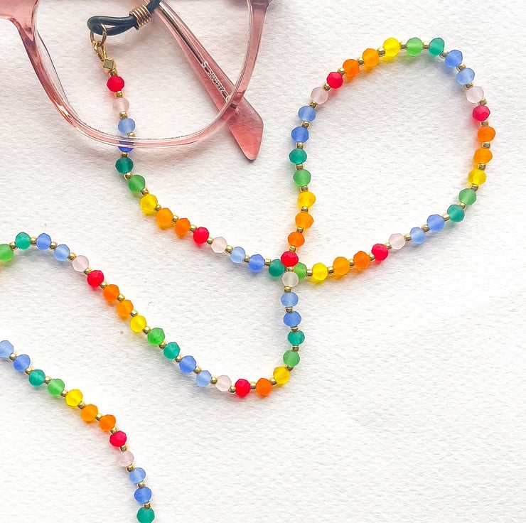 Bright, joyful and practical, this rainbow beaded glasses chain brings a little extra cheer to your everyday. Handmade with care using a run of vibrant rainbow glass beads, spaced with delicate gold seed beads, it’s a fun and functional accessory for your glasses or sunglasses.